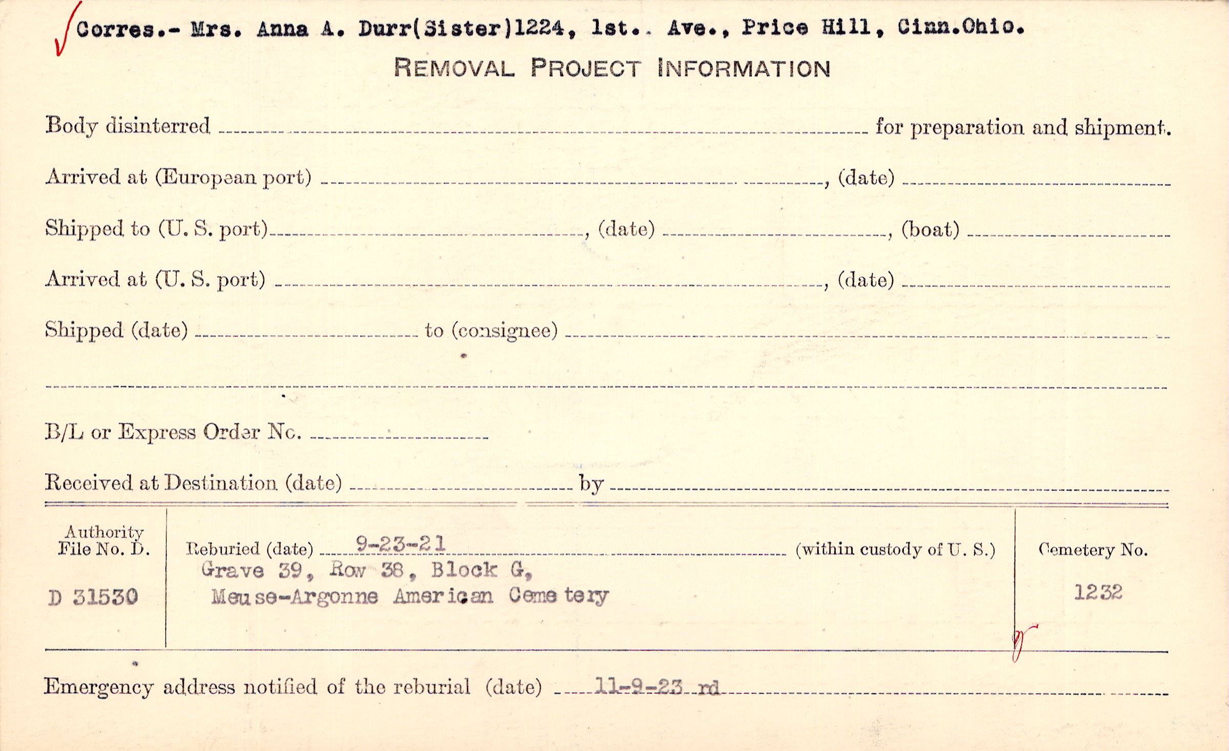 Corres.-Mrs. Anna A. Durr (Sister) 1224, 1st. Ave., Price Hill, Cinn. Ohio |