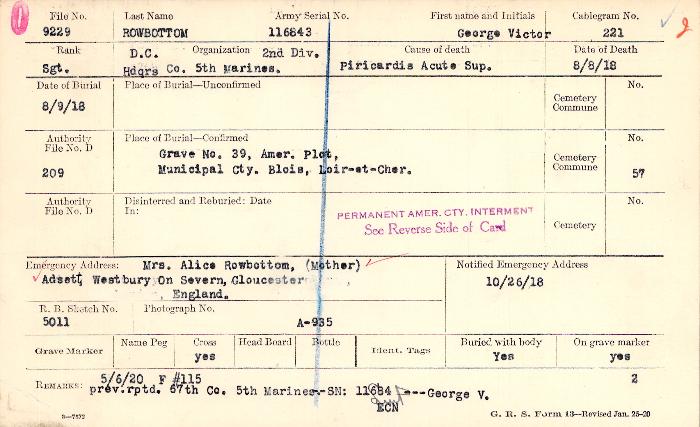 prev. rptd. 67th Co. 5th Marines-.-SN: 11684 --- George V., 5/6/20 F #115