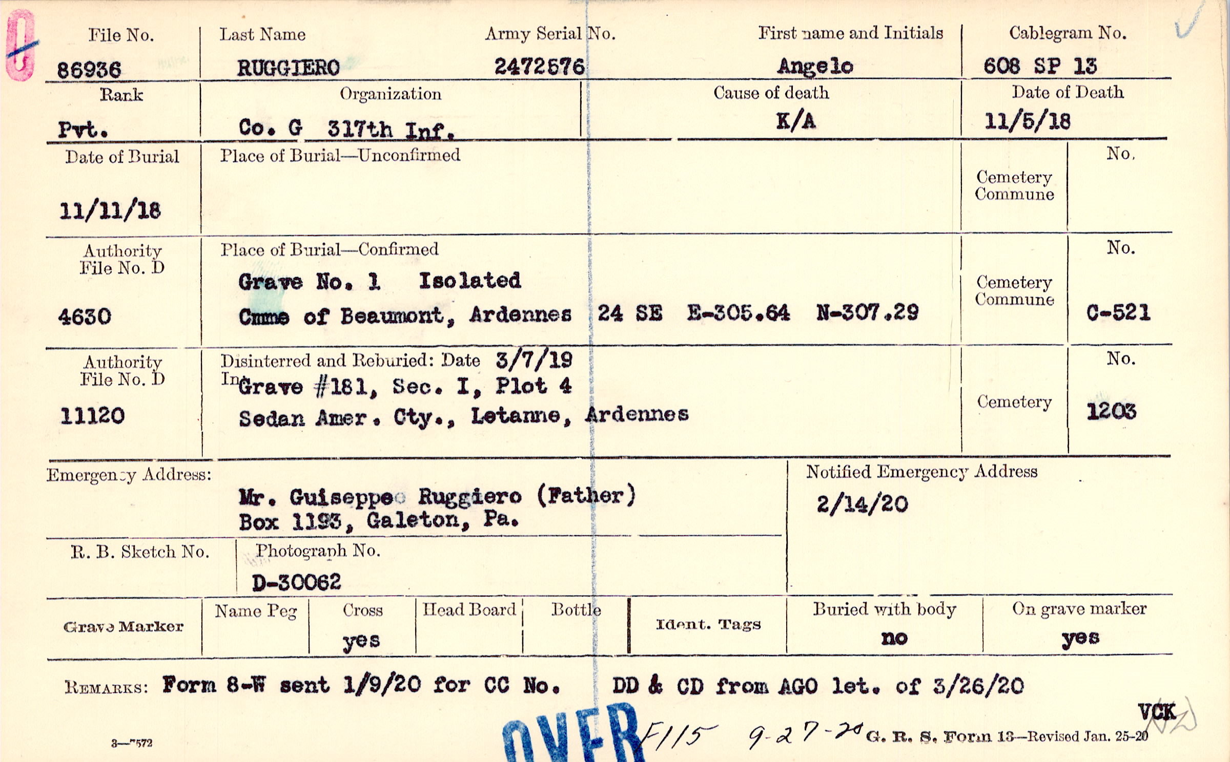 Mr. Guiseppe Ruggiero (Father), Box 1193, Galeton, Pa.