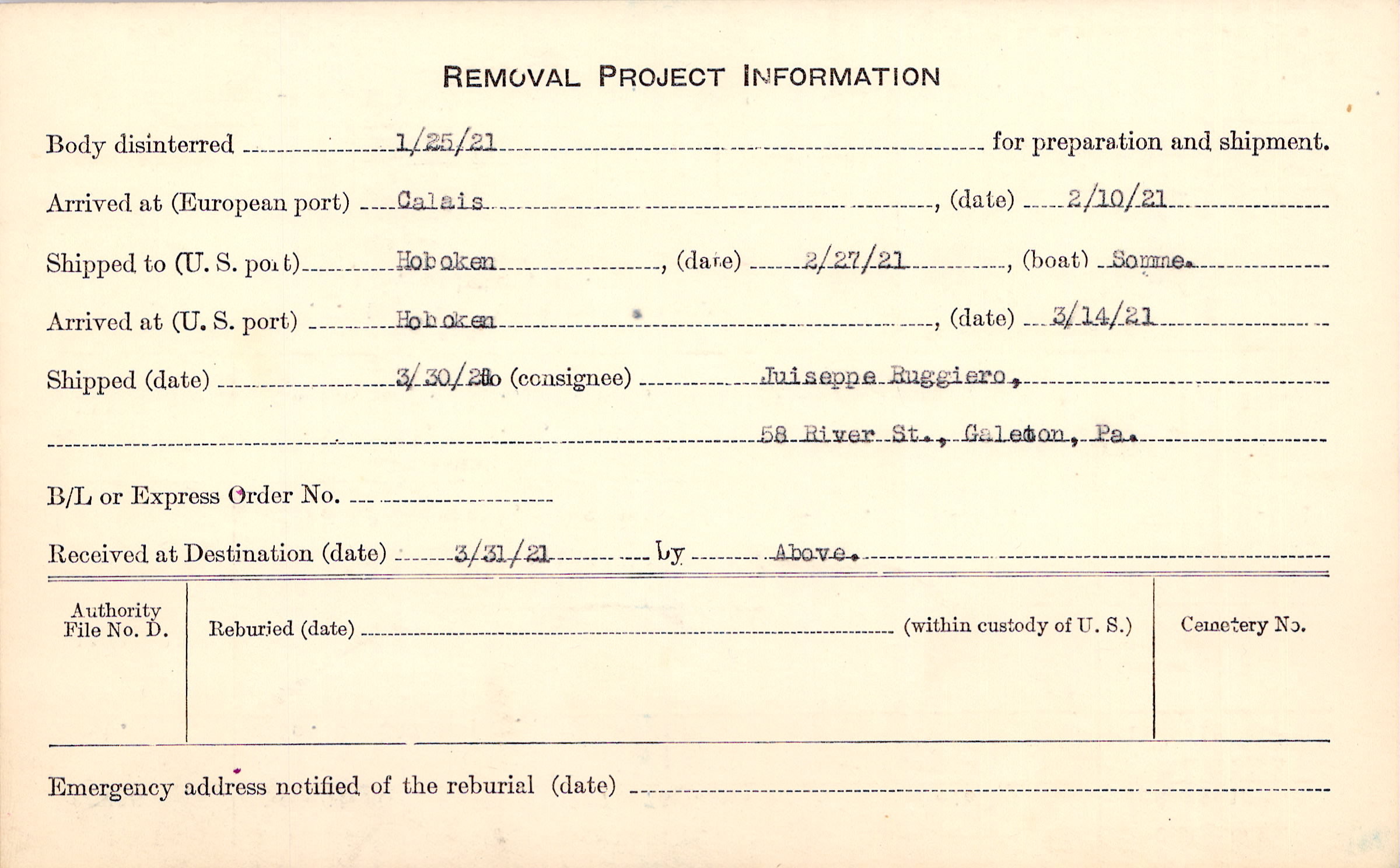 Body disinterred 1/25/1921 for preparation and shipment.
