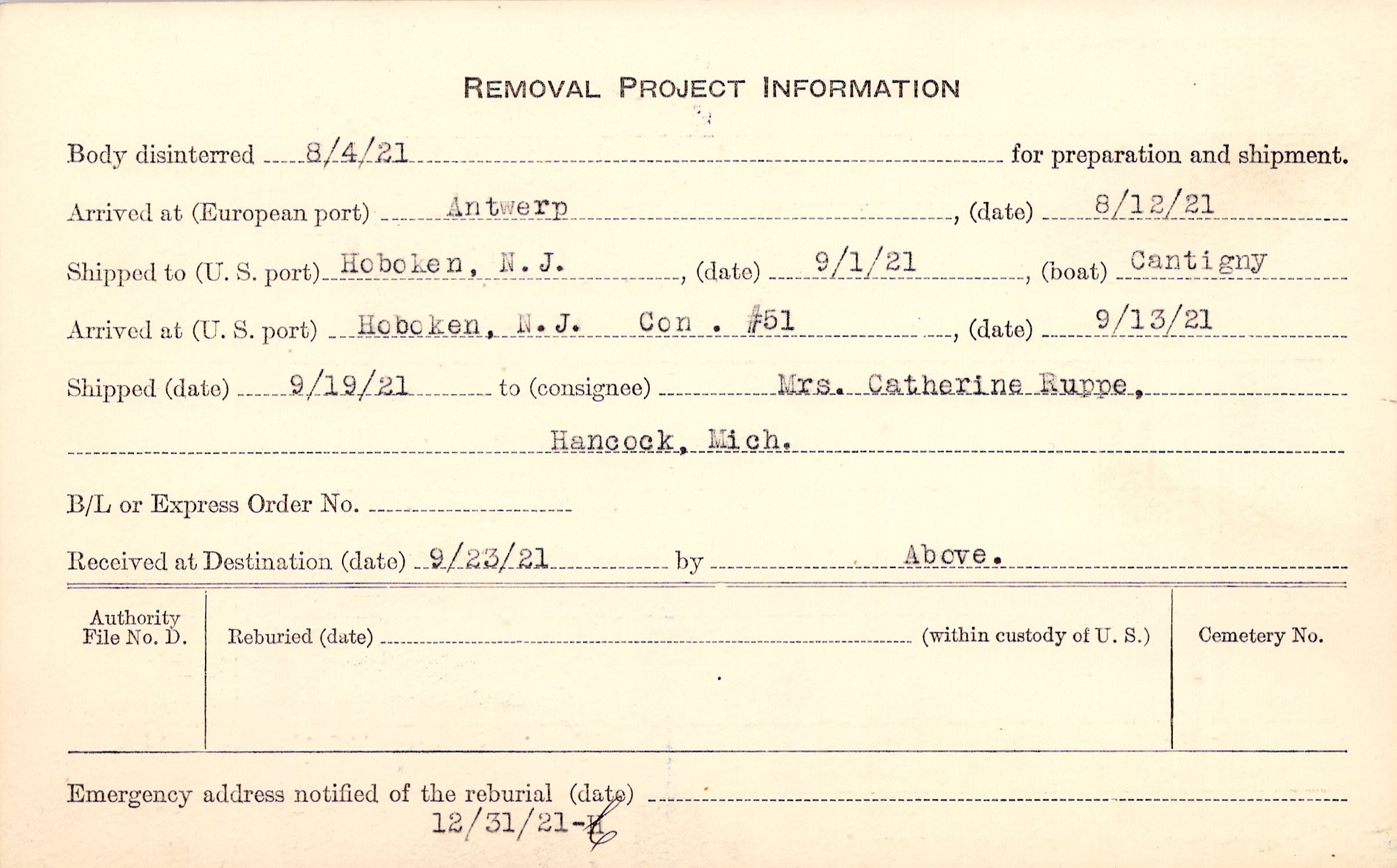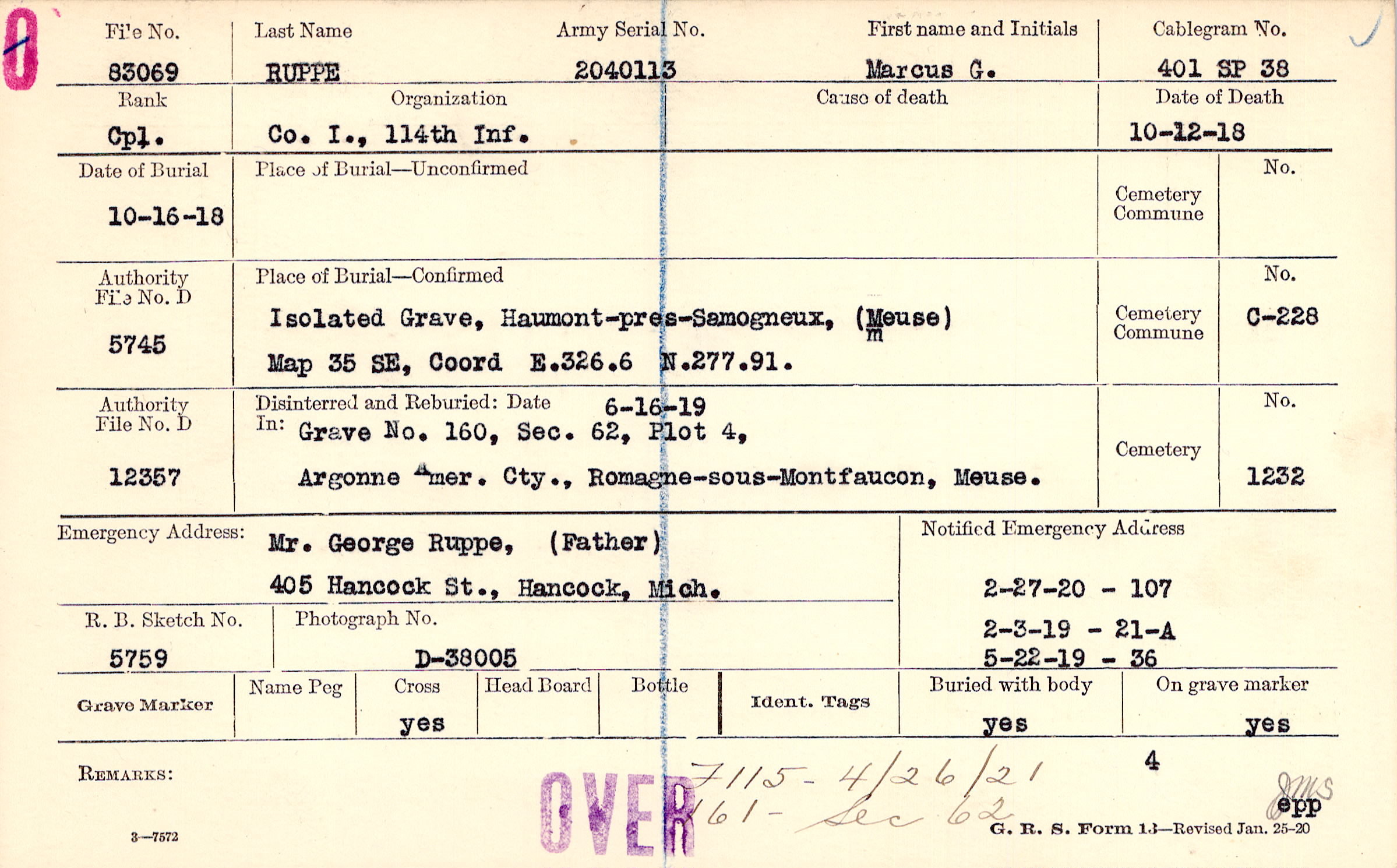 Mr. George Ruppe, (Father), 405 Hancock St., Hancock, Mich.