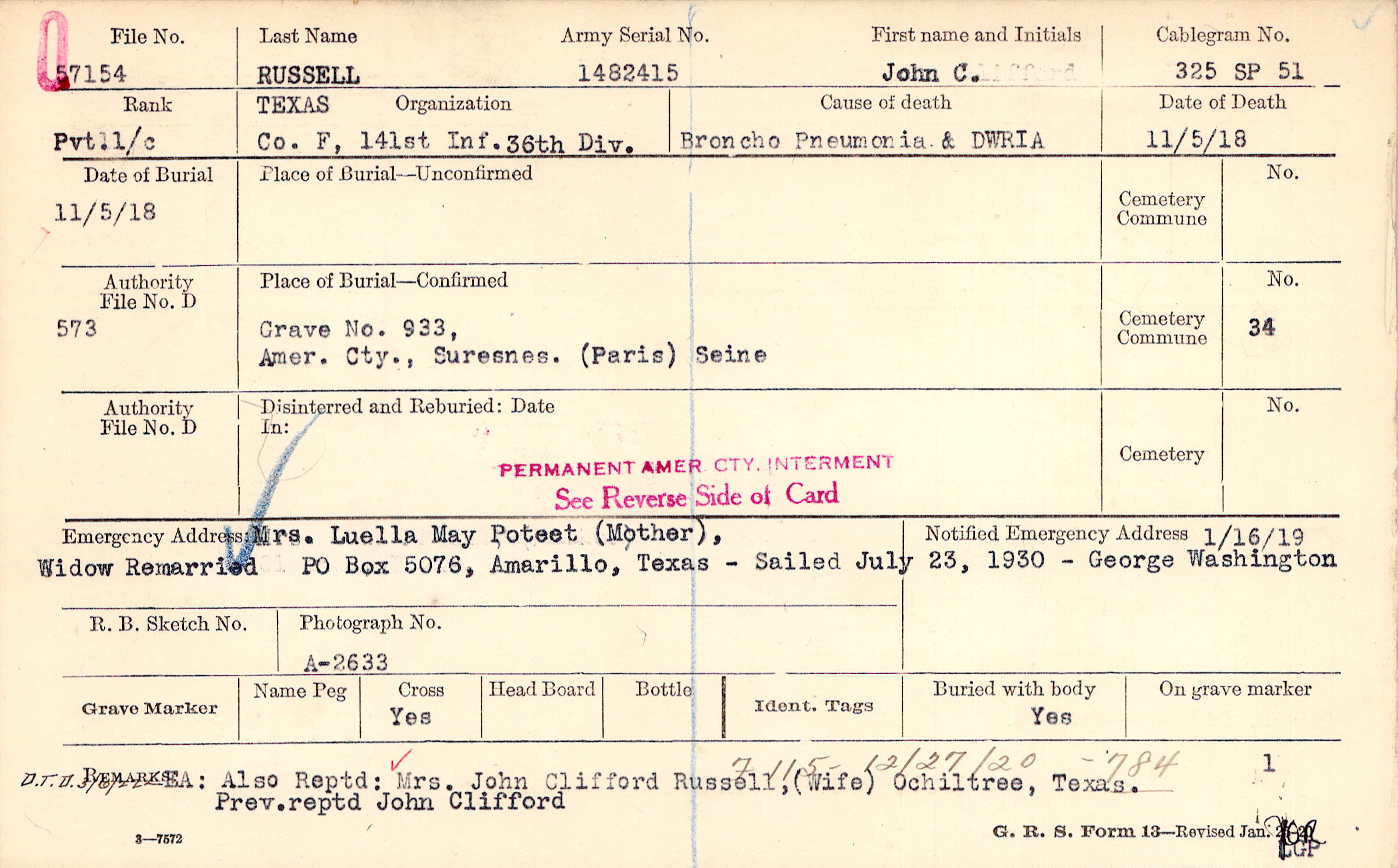 Mrs. Luella May Poteet (Mother),, PO Box 5076, Amarillo, Texas, Widow Remarried - Sailed July 23, 1930 - George Washington