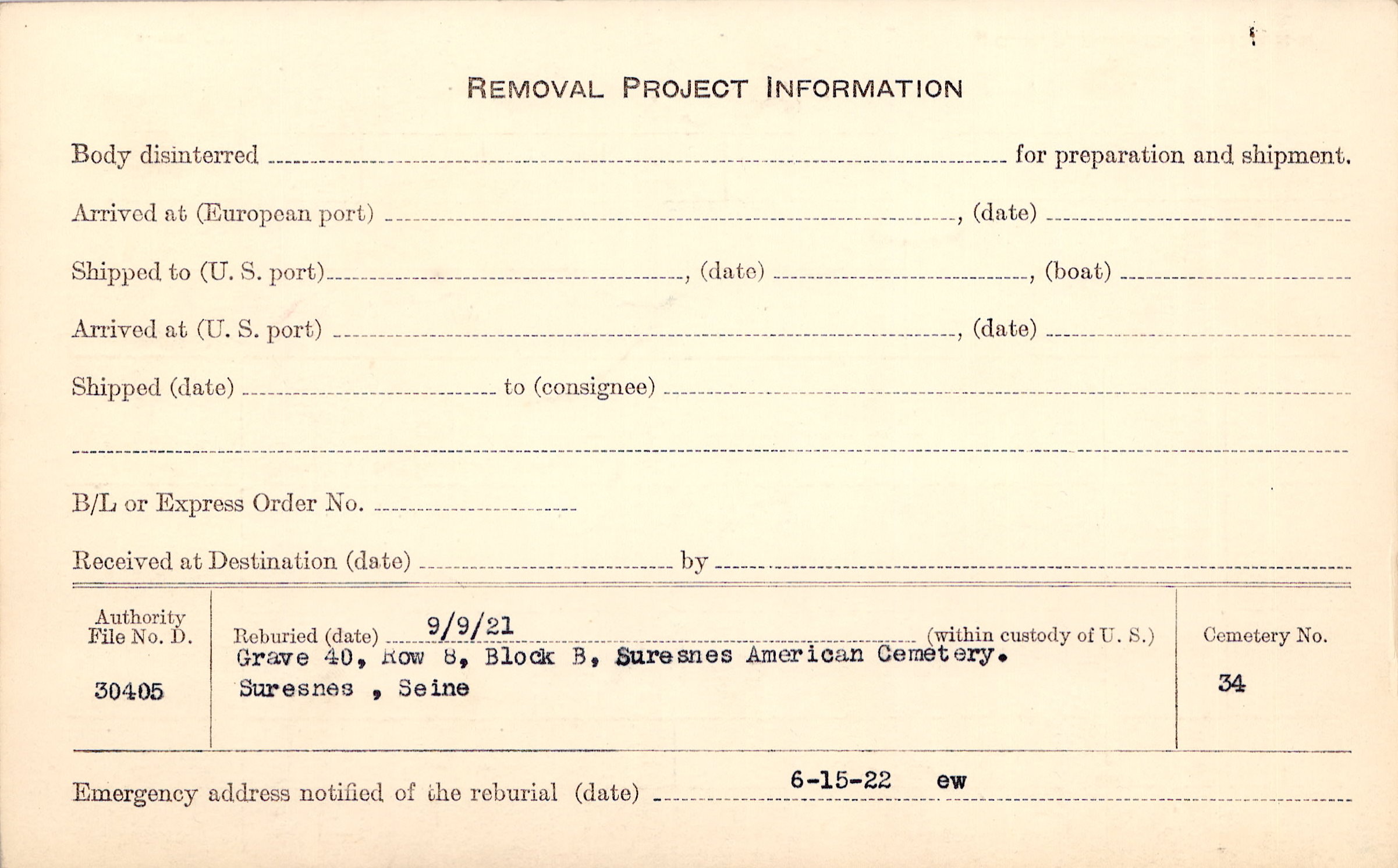 | Permanent Burial in Foreign Cemetery |
