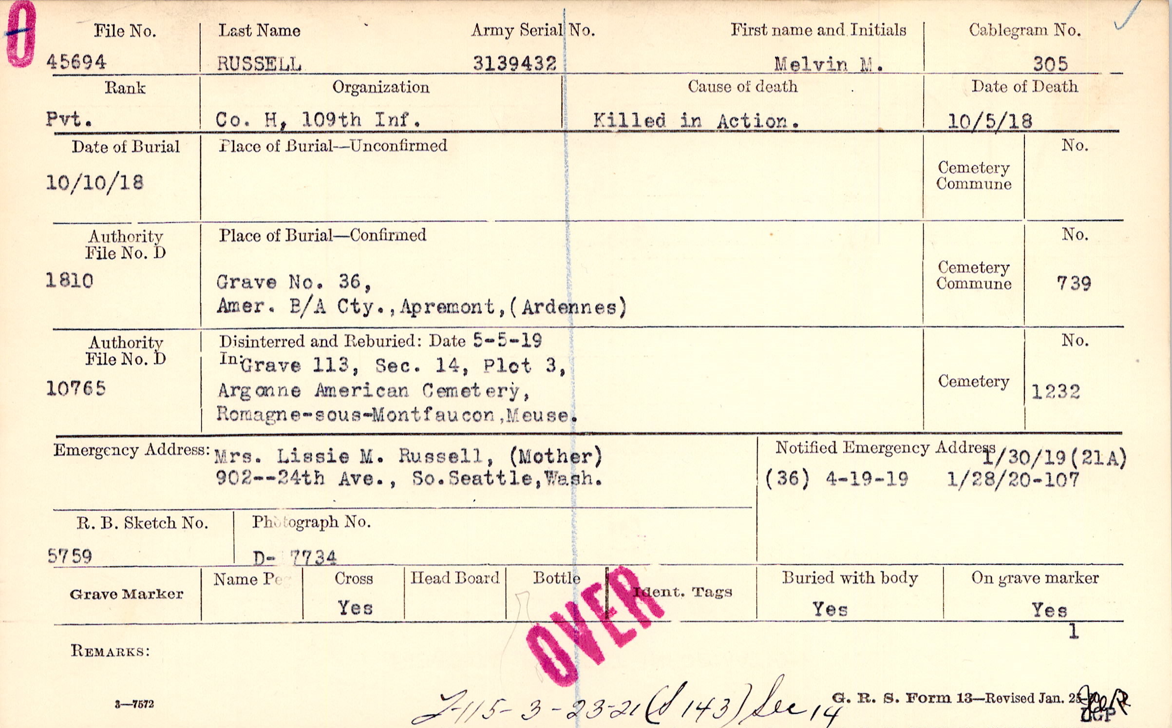Mrs. Lissie M. Russell, (Mother), 902--24th Ave., So. Seattle, Wash.