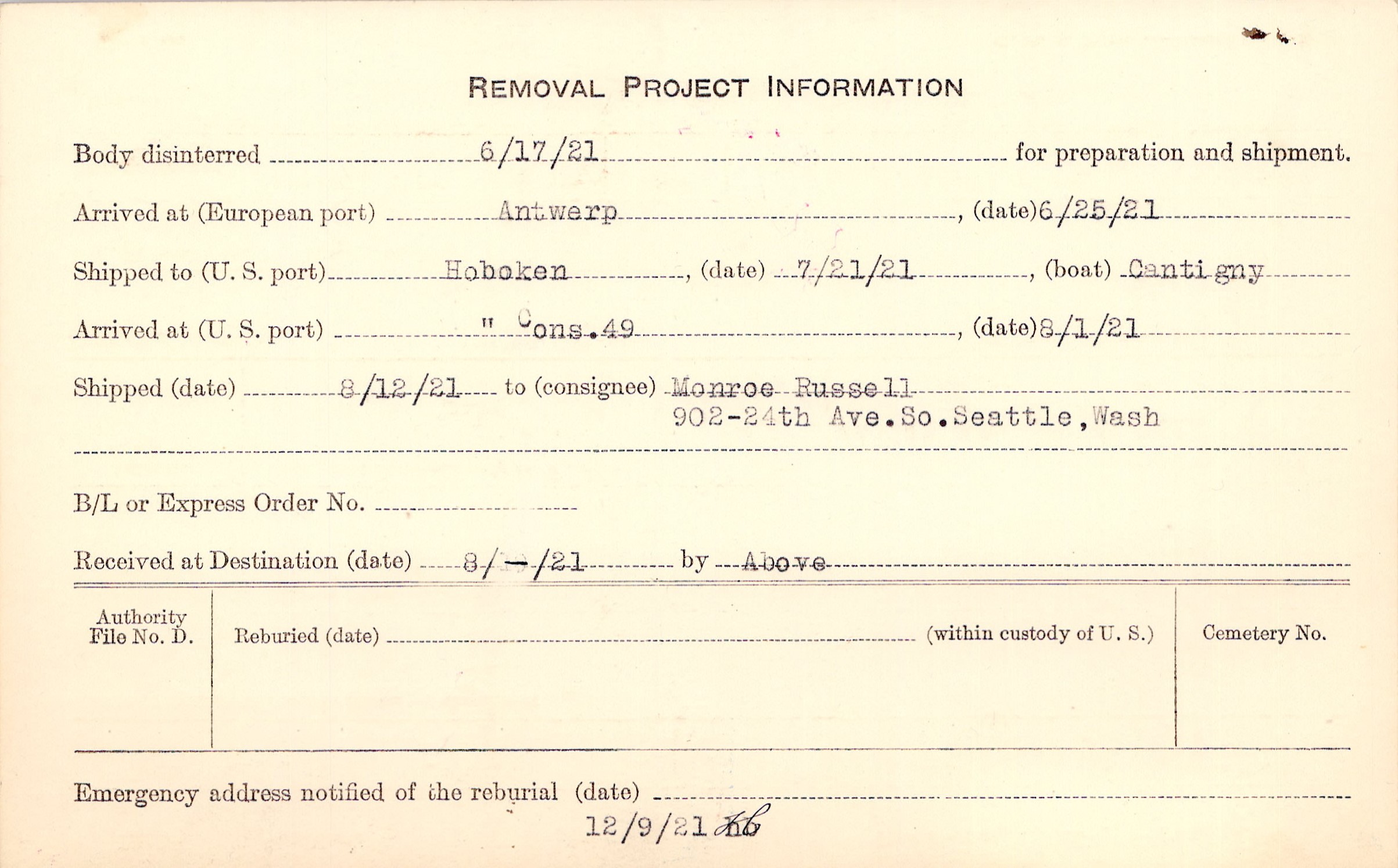 Body disinterred 6/17/1921 for preparation and shipment.