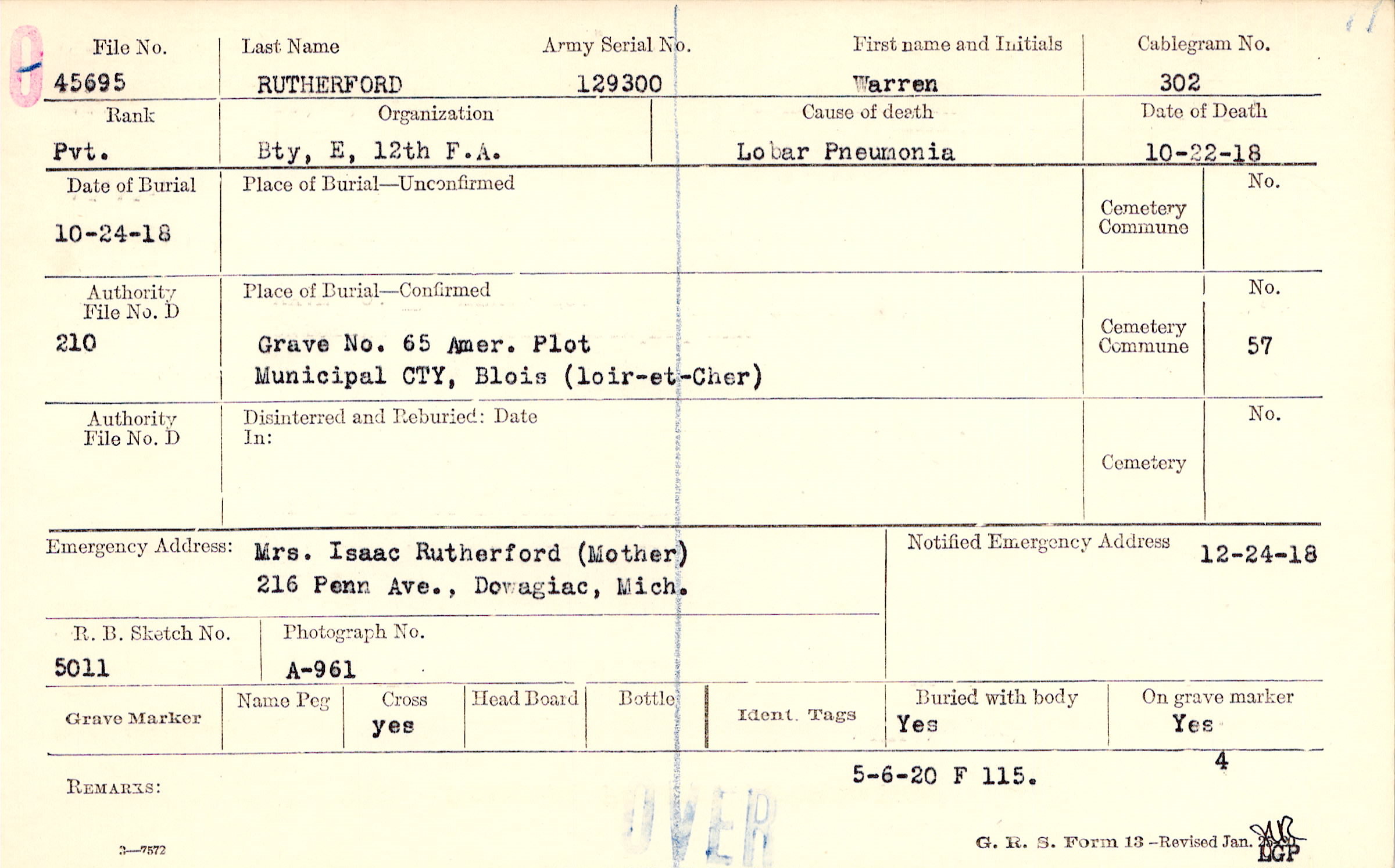 Grave 65, Amer. Plot, Municipal CTY, Blois (loir-et-Cher)