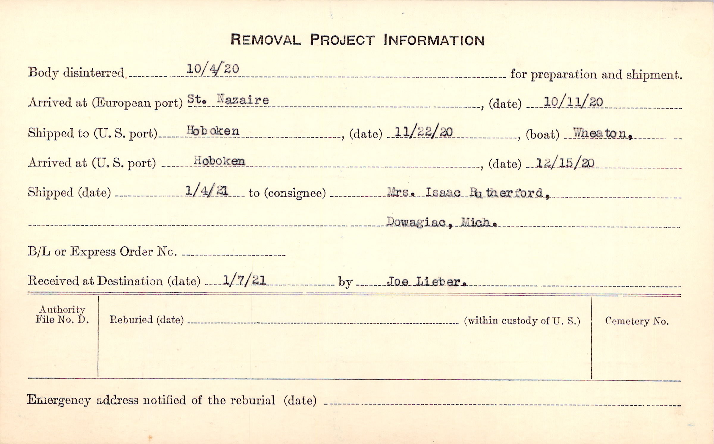 Body disinterred 10/4/1920 for preparation and shipment.