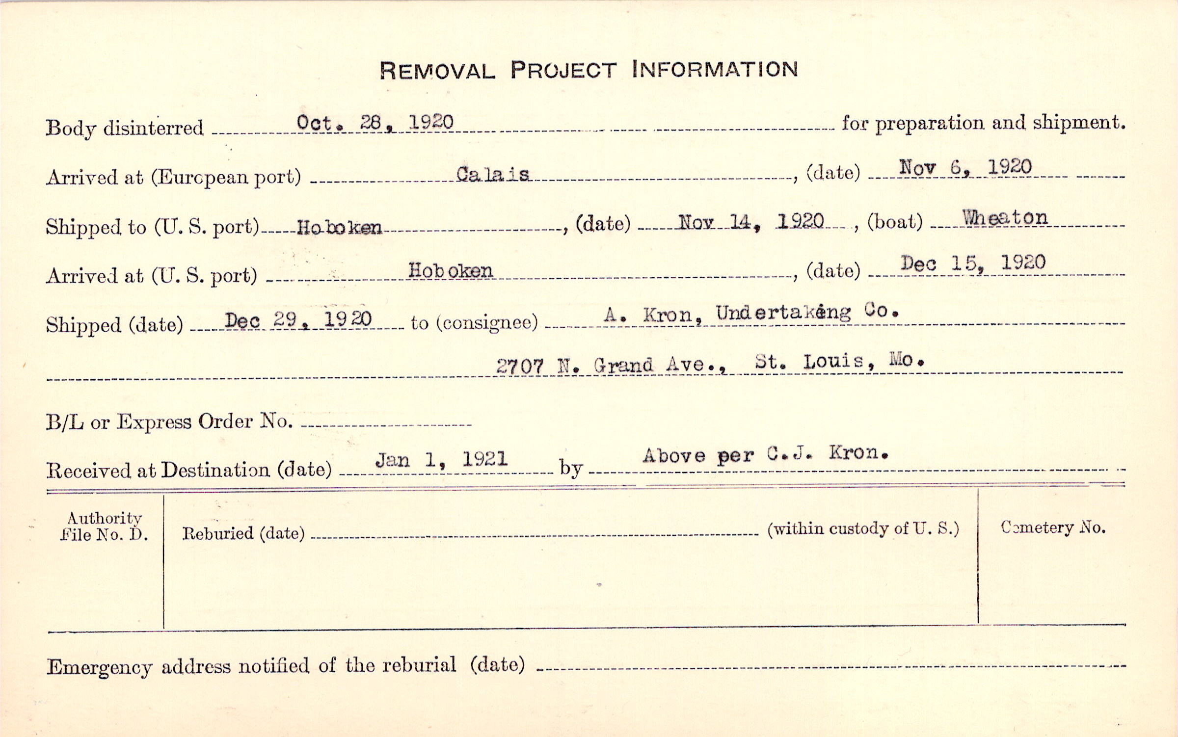 to A. Kron, Undertaking Co., 2707 N. Grand Ave., St. Louis, Mo.
