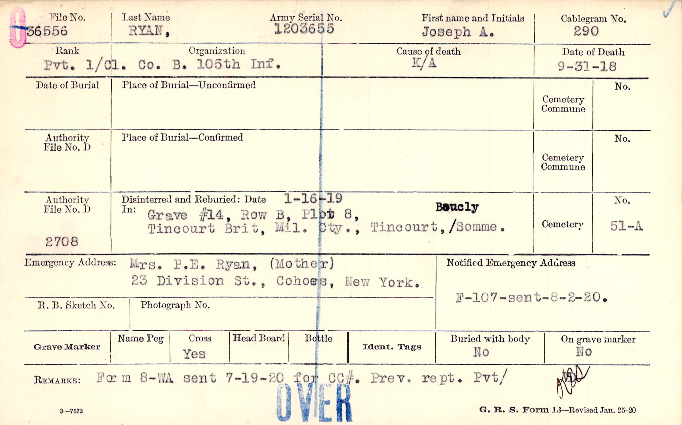 Mrs P. E. Ryan, (Mother), 23 Division St., Cohoes, New York.