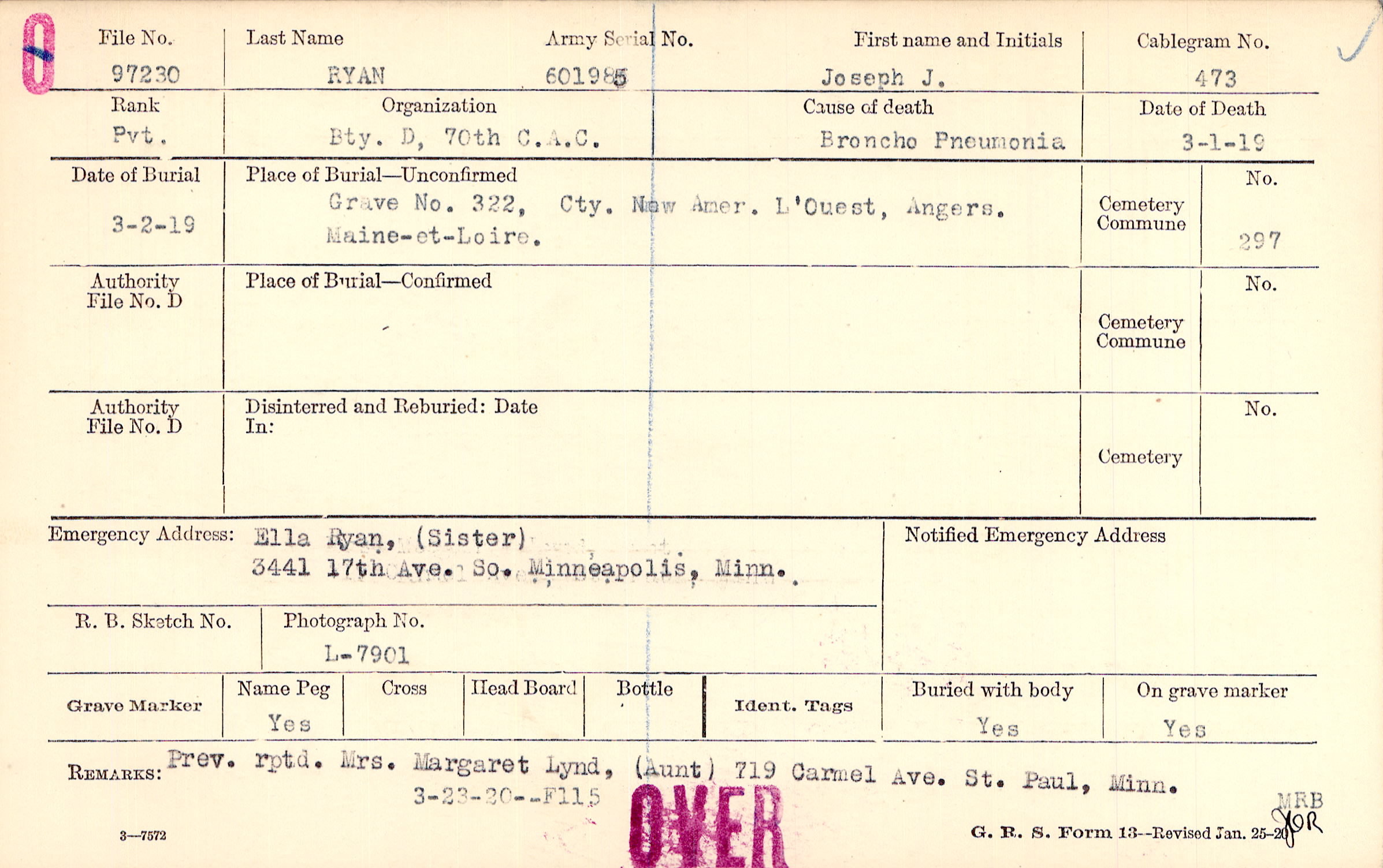 Grave No. 322, Cty. New Amer., L'Ouest, Angers., Maine-et-Loire.