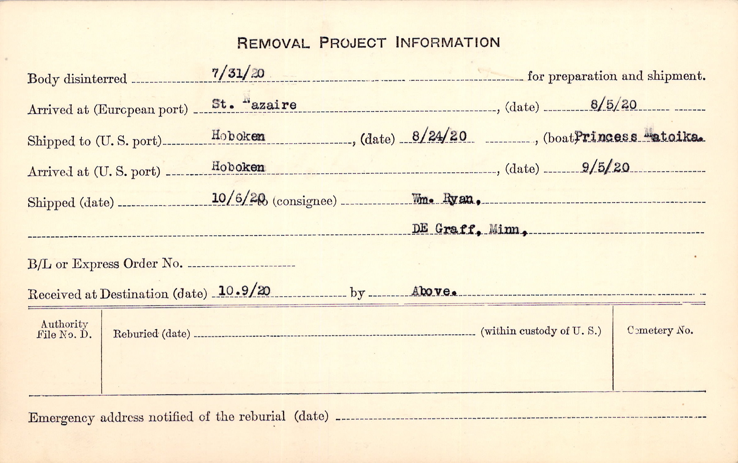 Body disinterred 7/31/1920 for preparation and shipment.