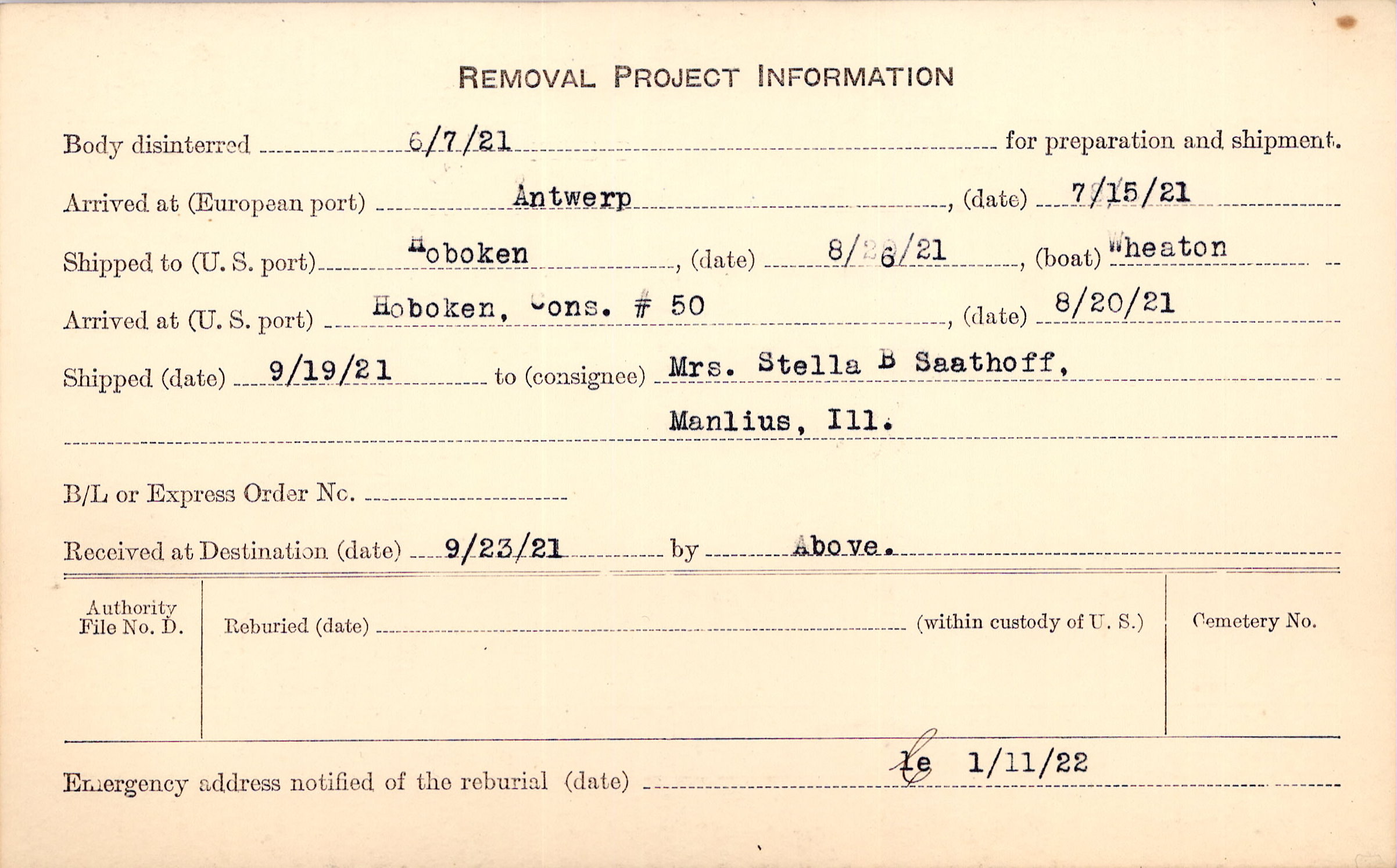 Body disinterred 6/7/1921 for preparation and shipment.
