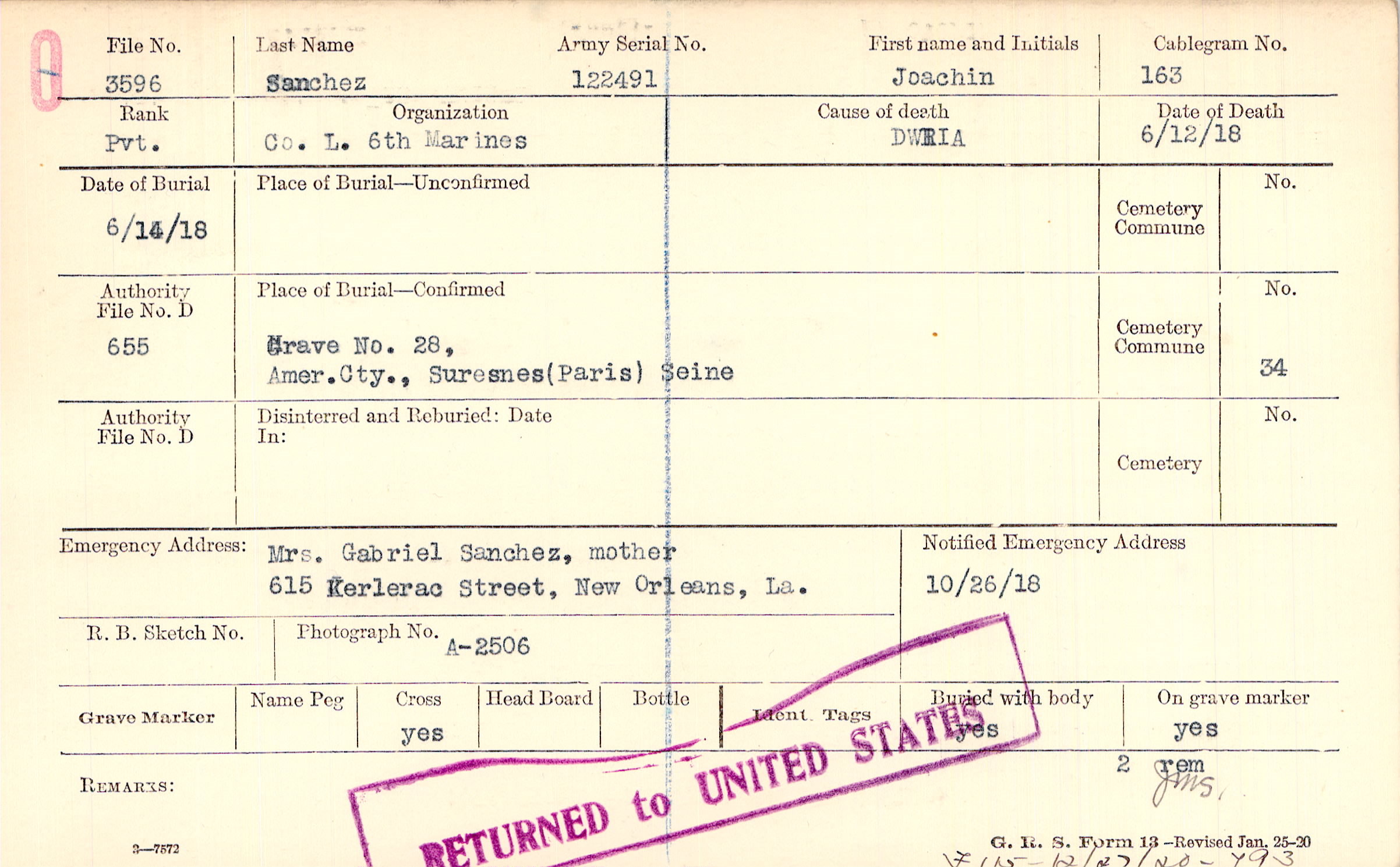 Mrs. Gabriel Sanchez, mother, 615 Kerlerac Street, New Orleans, La.