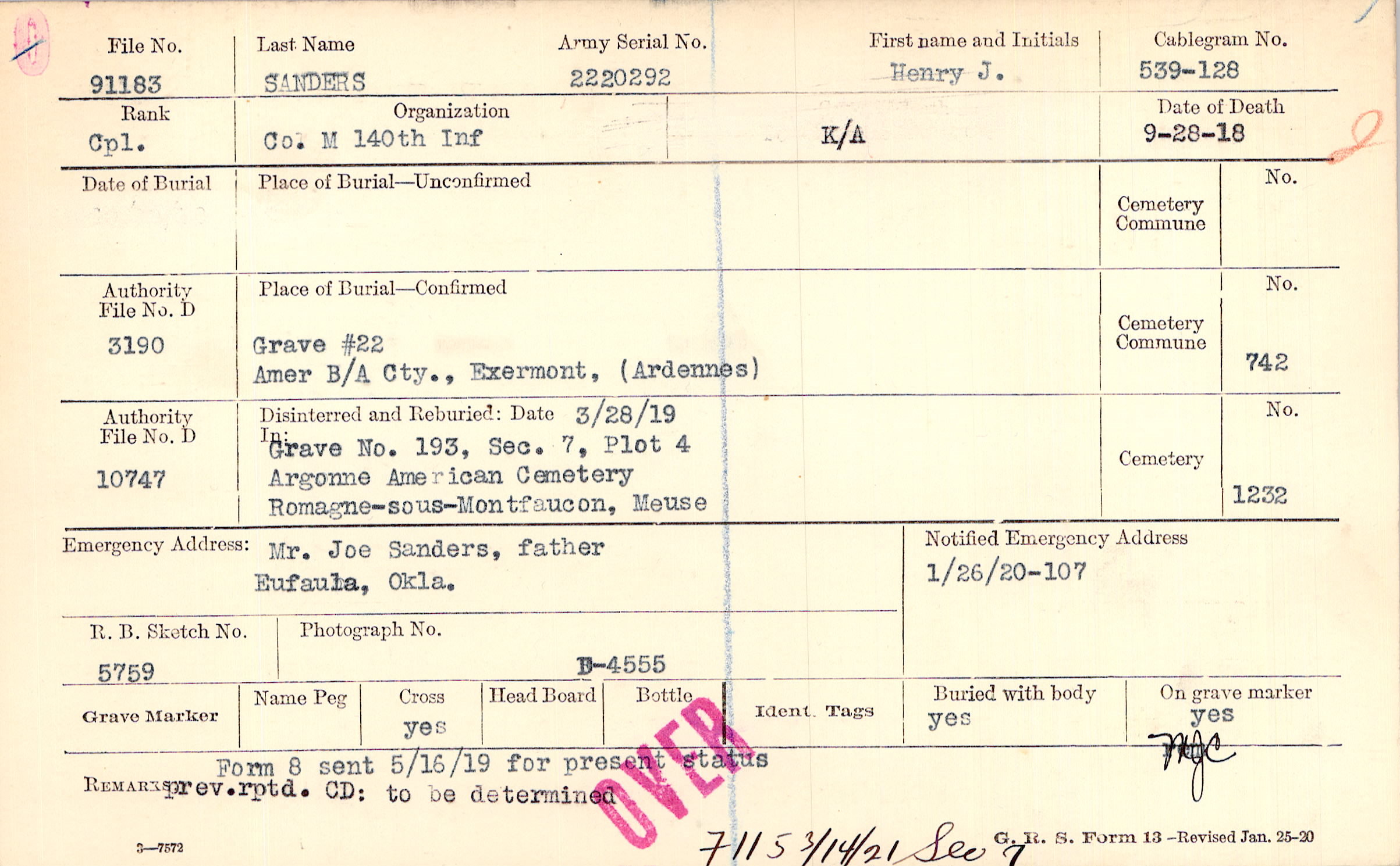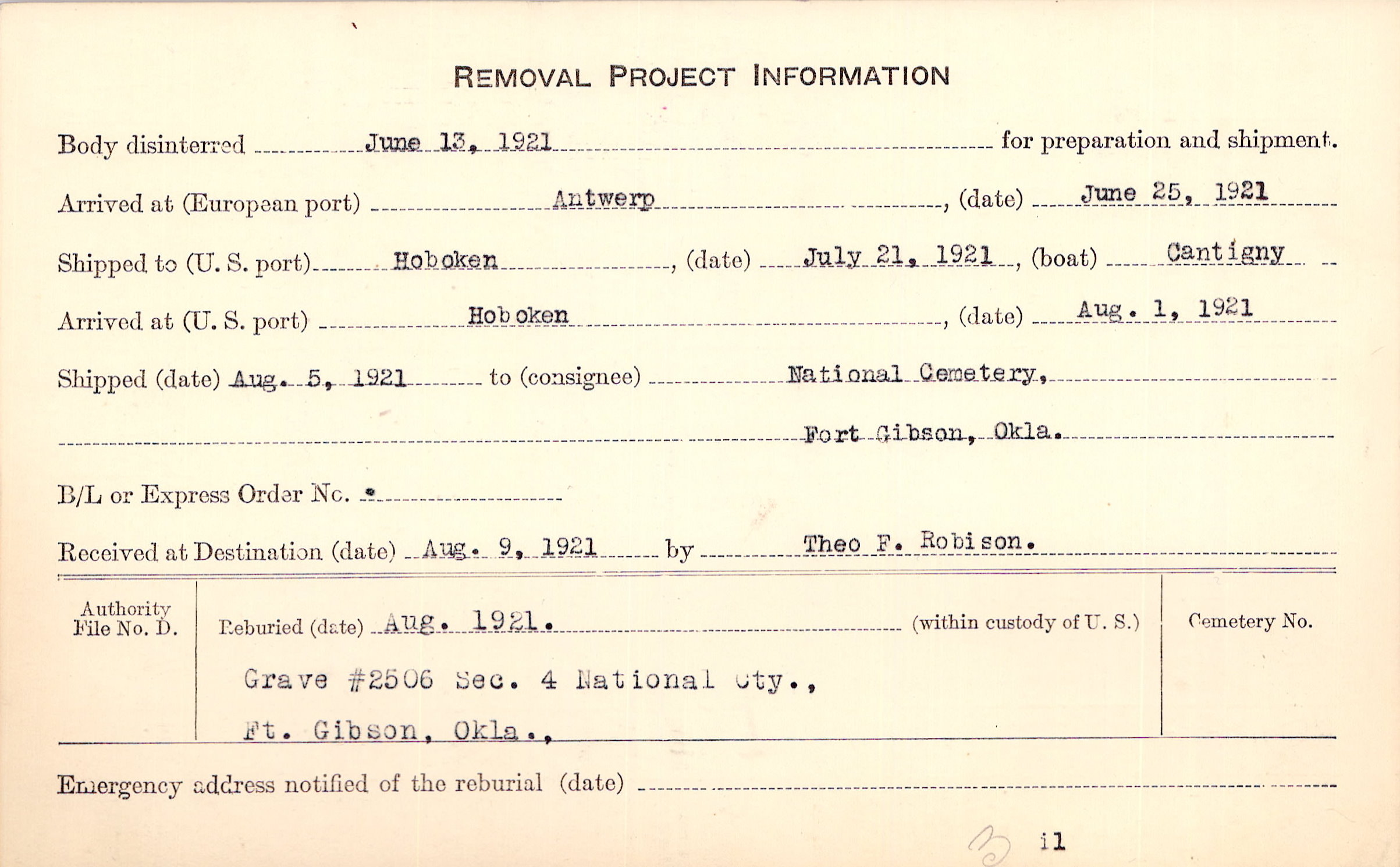 Body disinterred 6/13/1921 for preparation and shipment.