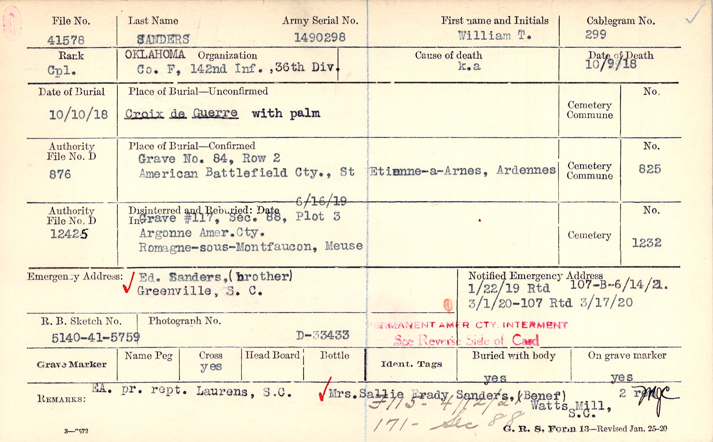1/22/1919 Rtd, Form 107: B 6/14/19 Form 21: , Form 107: 3/1/1920 Rtd 3/17/1920
