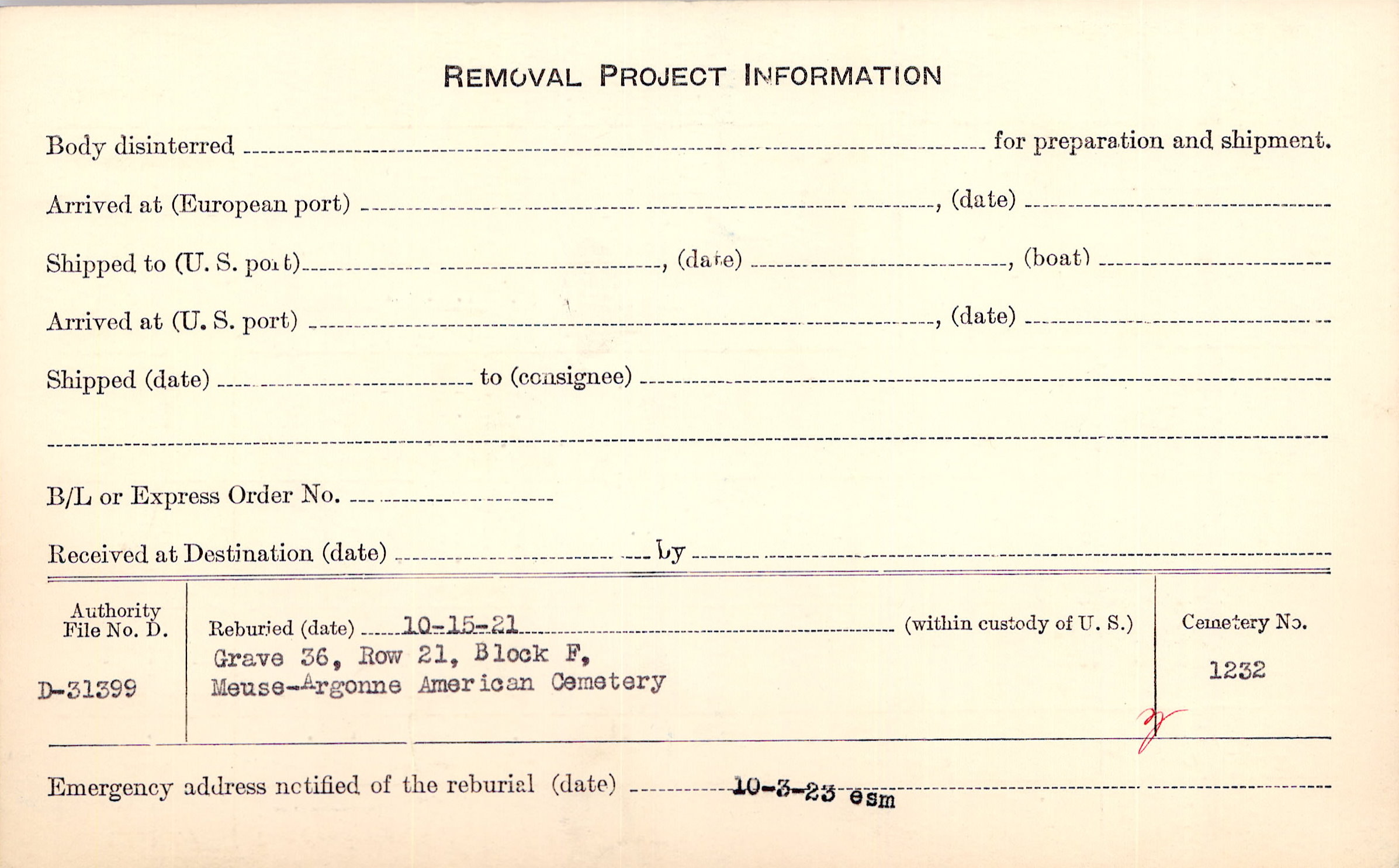 | Permanent Burial in Foreign Cemetery |