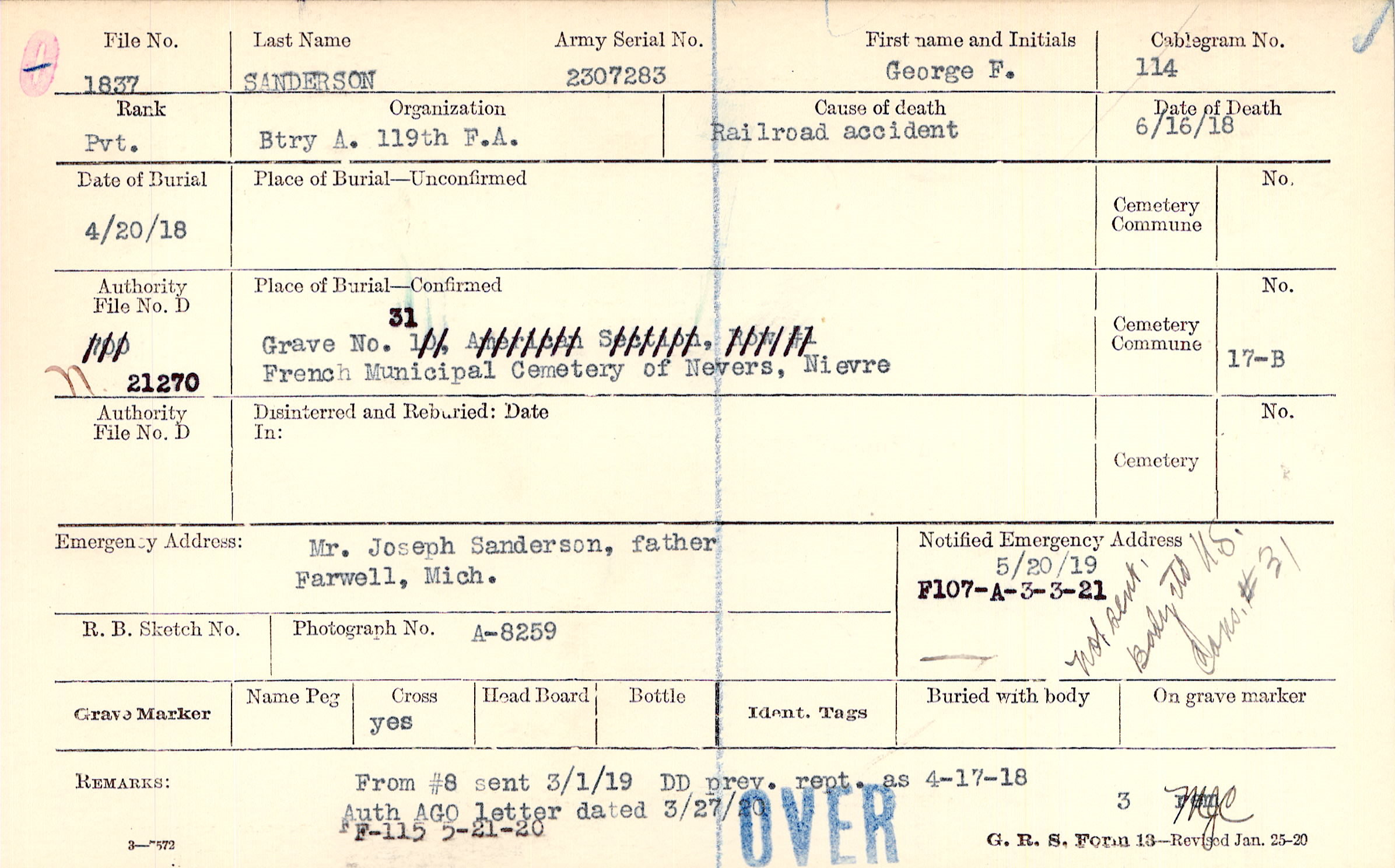 Mr. Joseph Sanderson, father, Farwell, Mich., Not sent, Body to U.S. Cons. #31