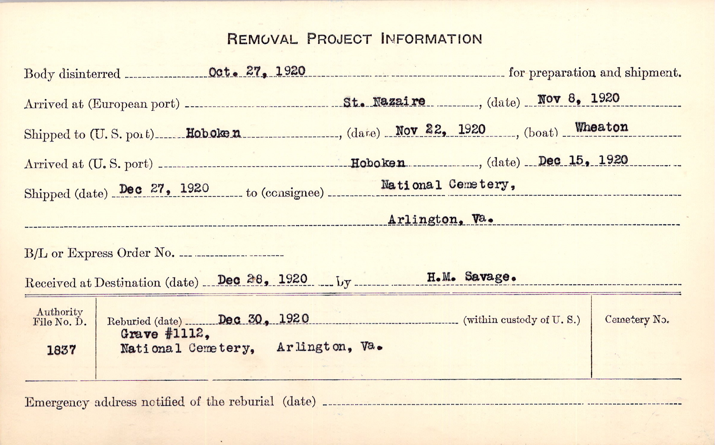 Body disinterred 10/27/1920 for preparation and shipment.