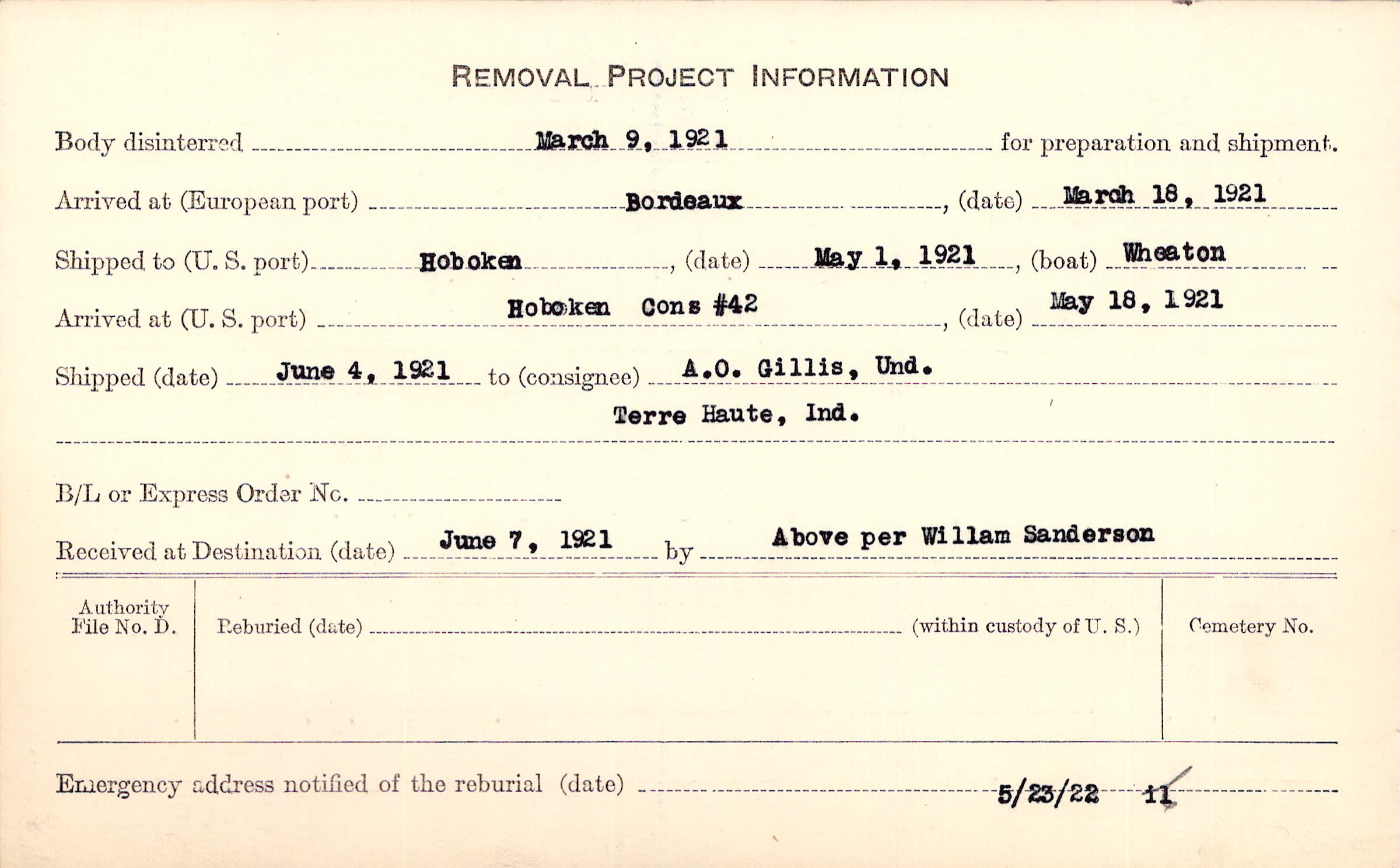 Body disinterred 3/9/1921 for preparation and shipment.