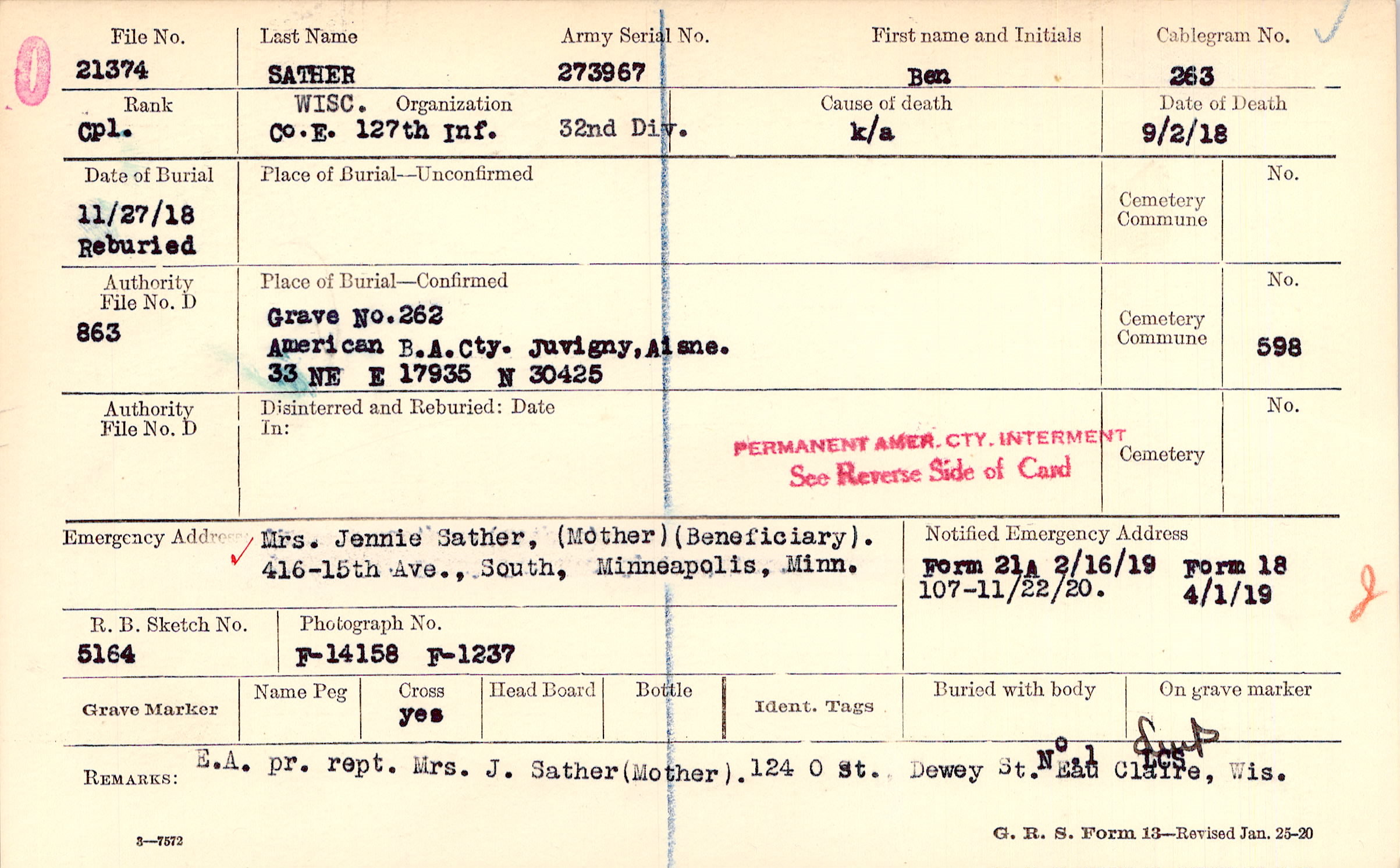 Mrs. Jennie Sather, (Mother) (Beneficiary)., 416-15th Ave., South, Minneapolis, Minn., (Beneficiary).
