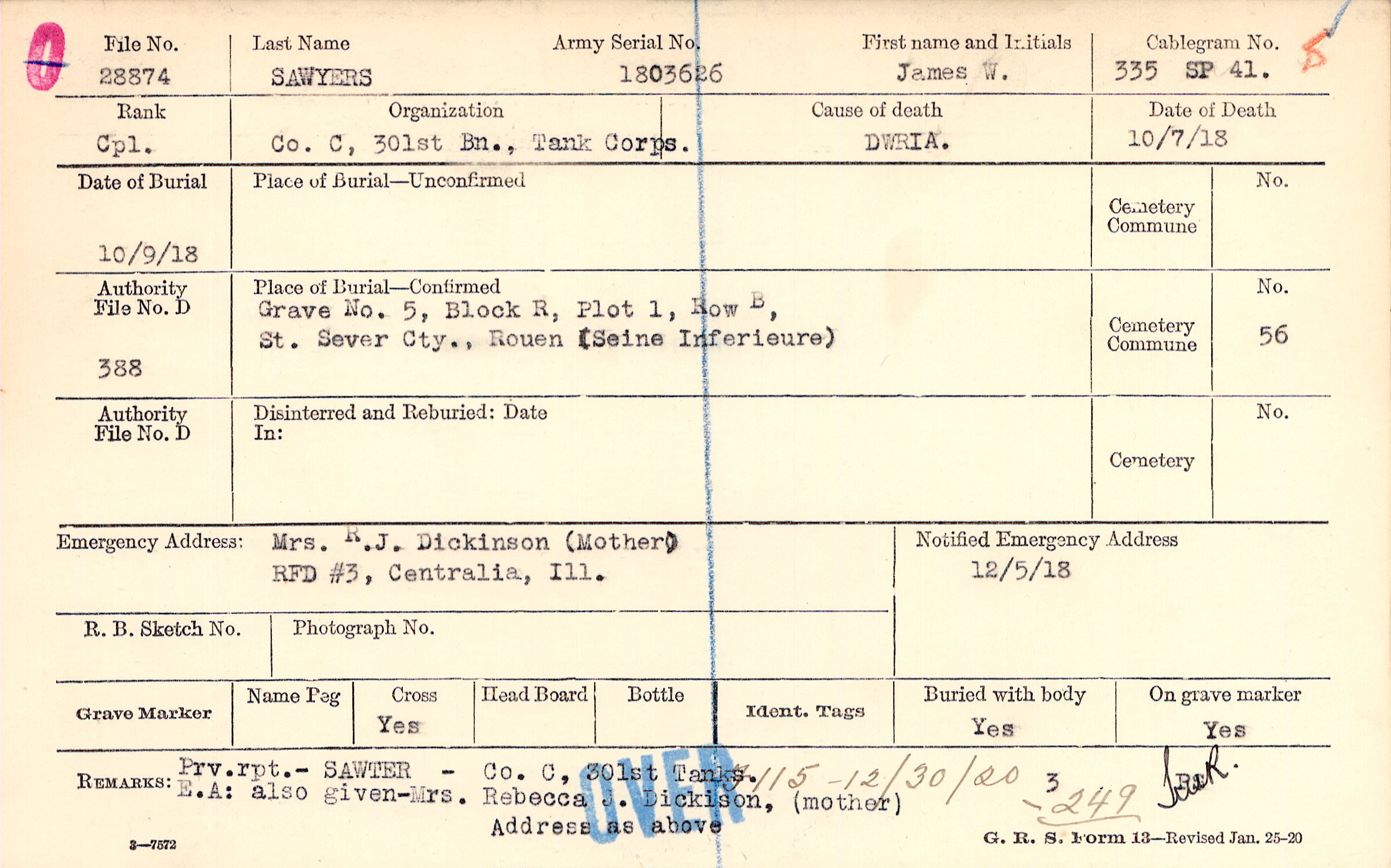 Grave 5, Block R, Plot 1, Row B, St. Sever Cty., Rouen, Seine Inferieure