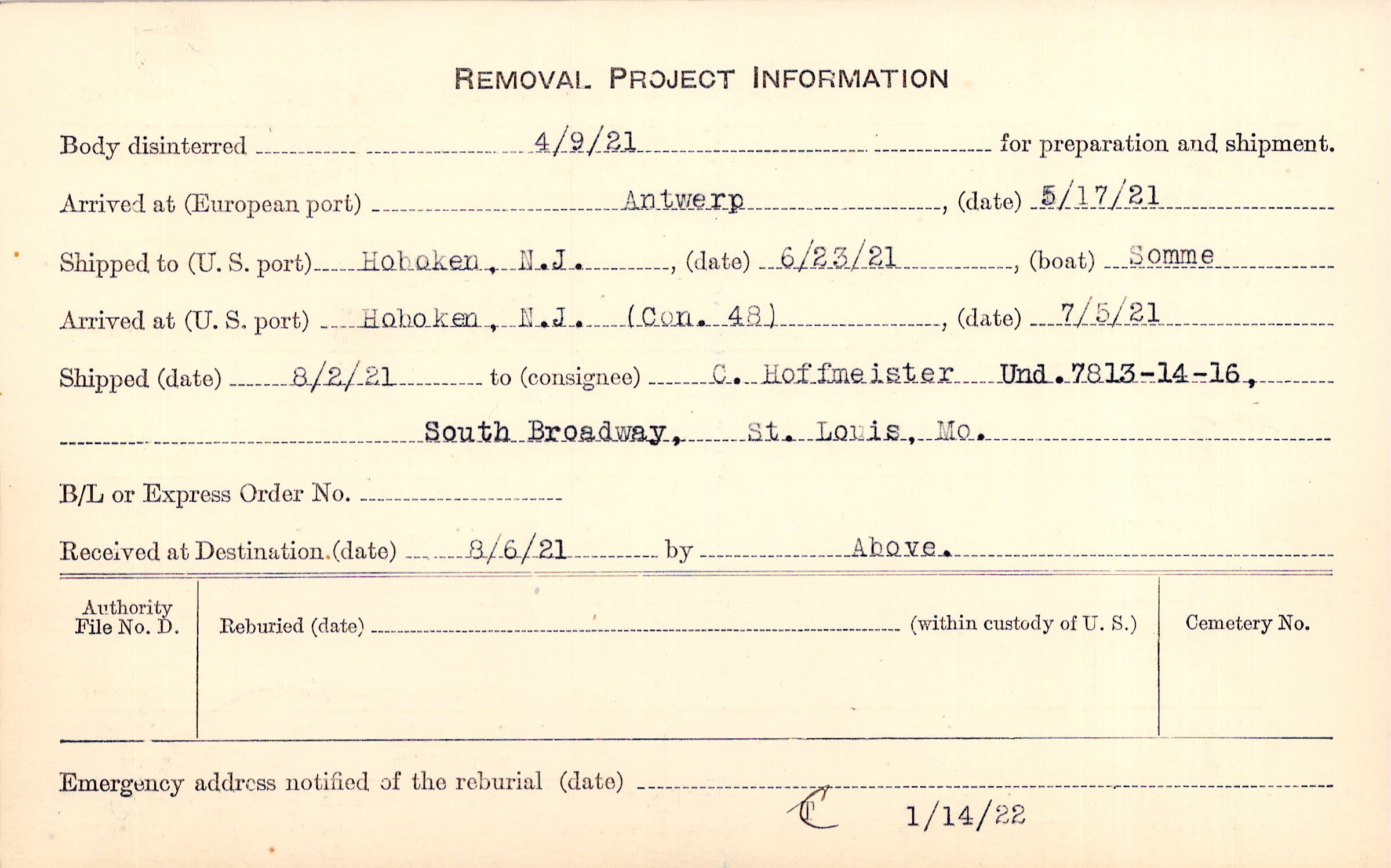 Body disinterred 4/9/1921 for preparation and shipment.