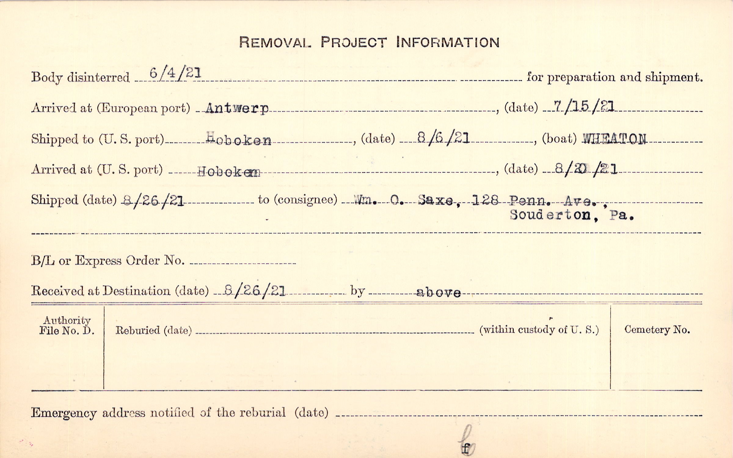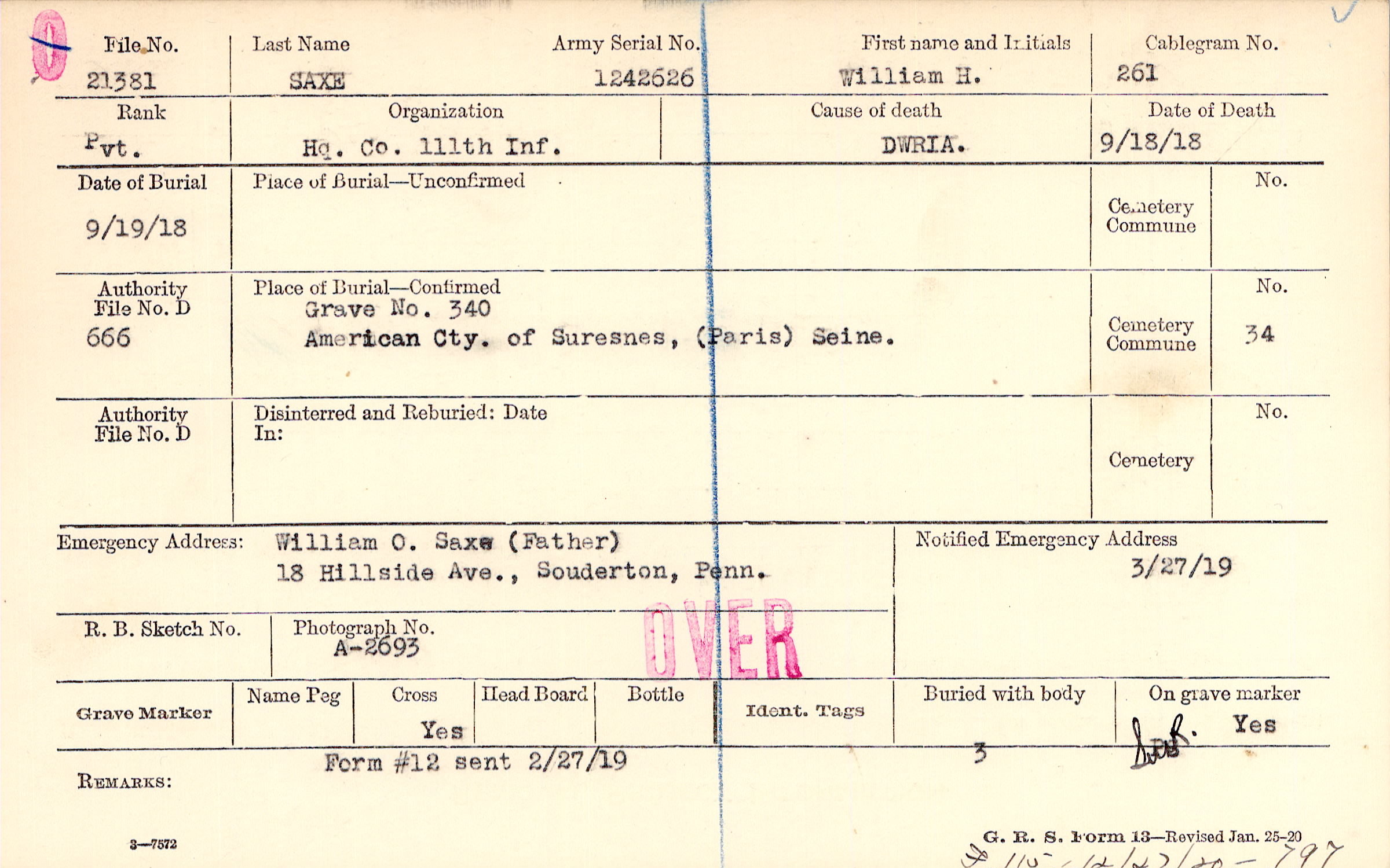 William O. Saxe (Father), 18 Hillside Ave., Souderton, Penn.