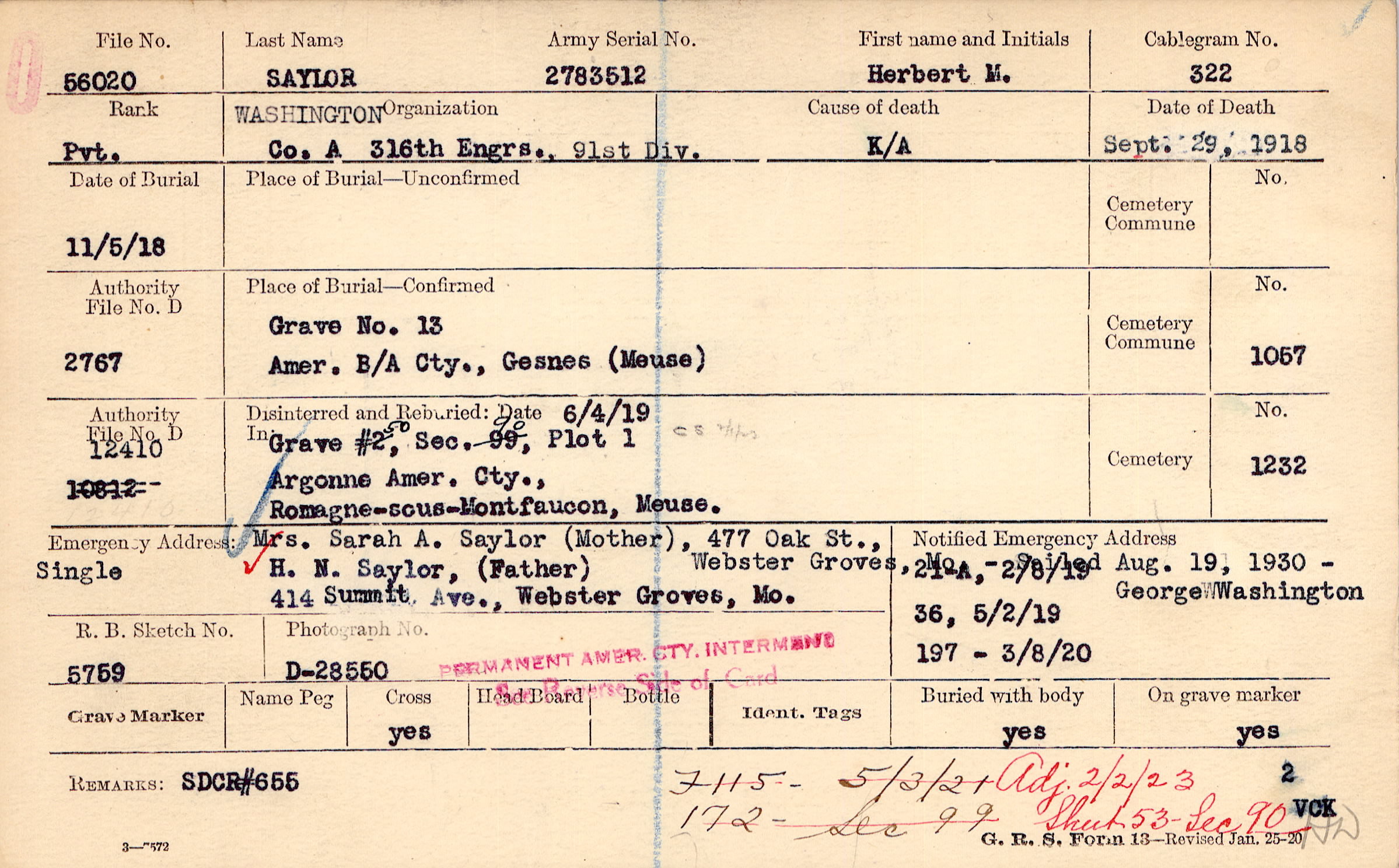 H. N. Saylor, (Father), 414 Summit Ave., Webster Groves, Mo., Single Mrs. Sarah A. Saylor (Mother), 477 Oak St., Webster Groves, Mo. - Sailed Aug. 19, 1930 - George Washington Permanent Amer. Cty. Interment See Reverse Side of Card