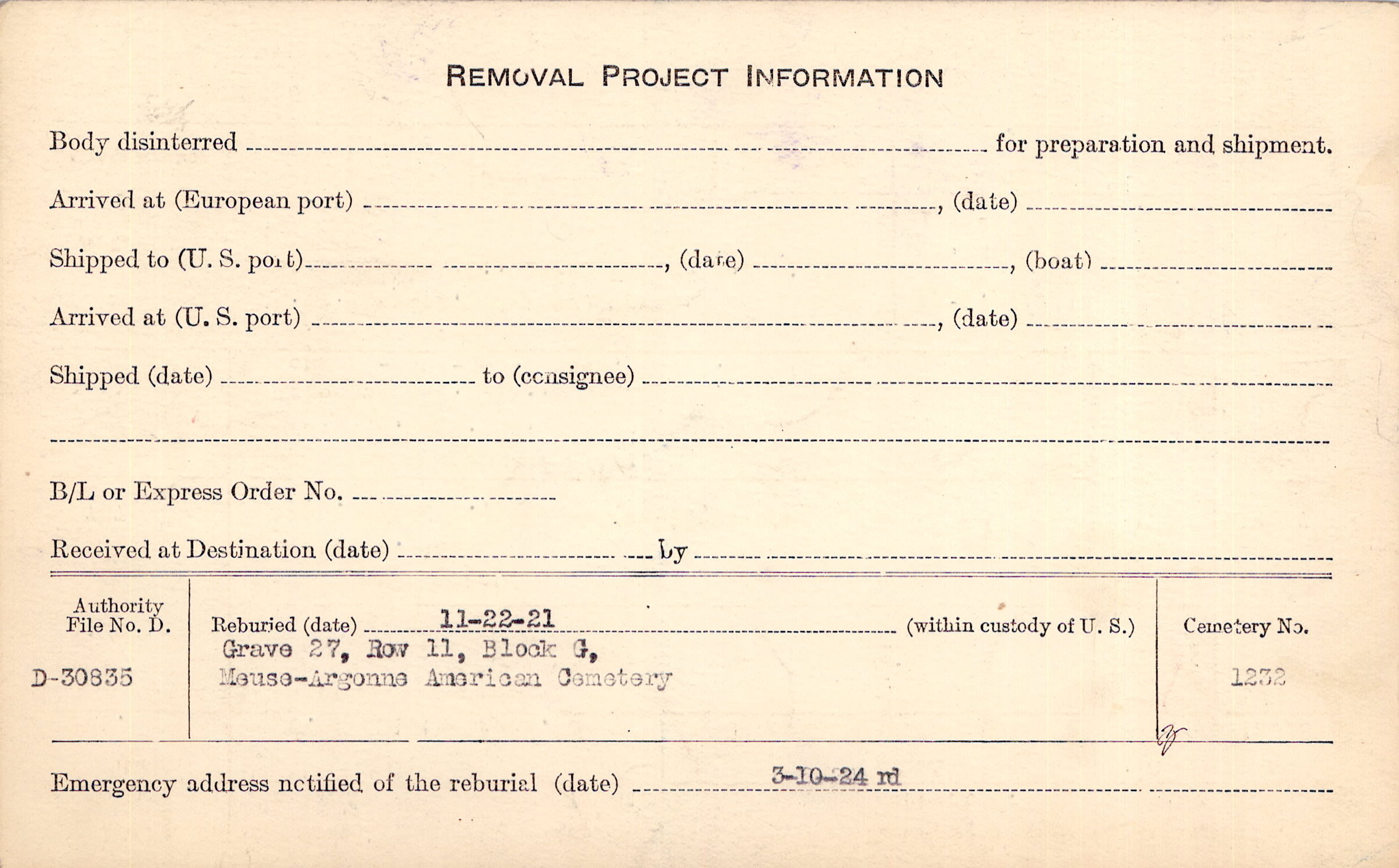 | Permanent Burial in Foreign Cemetery |