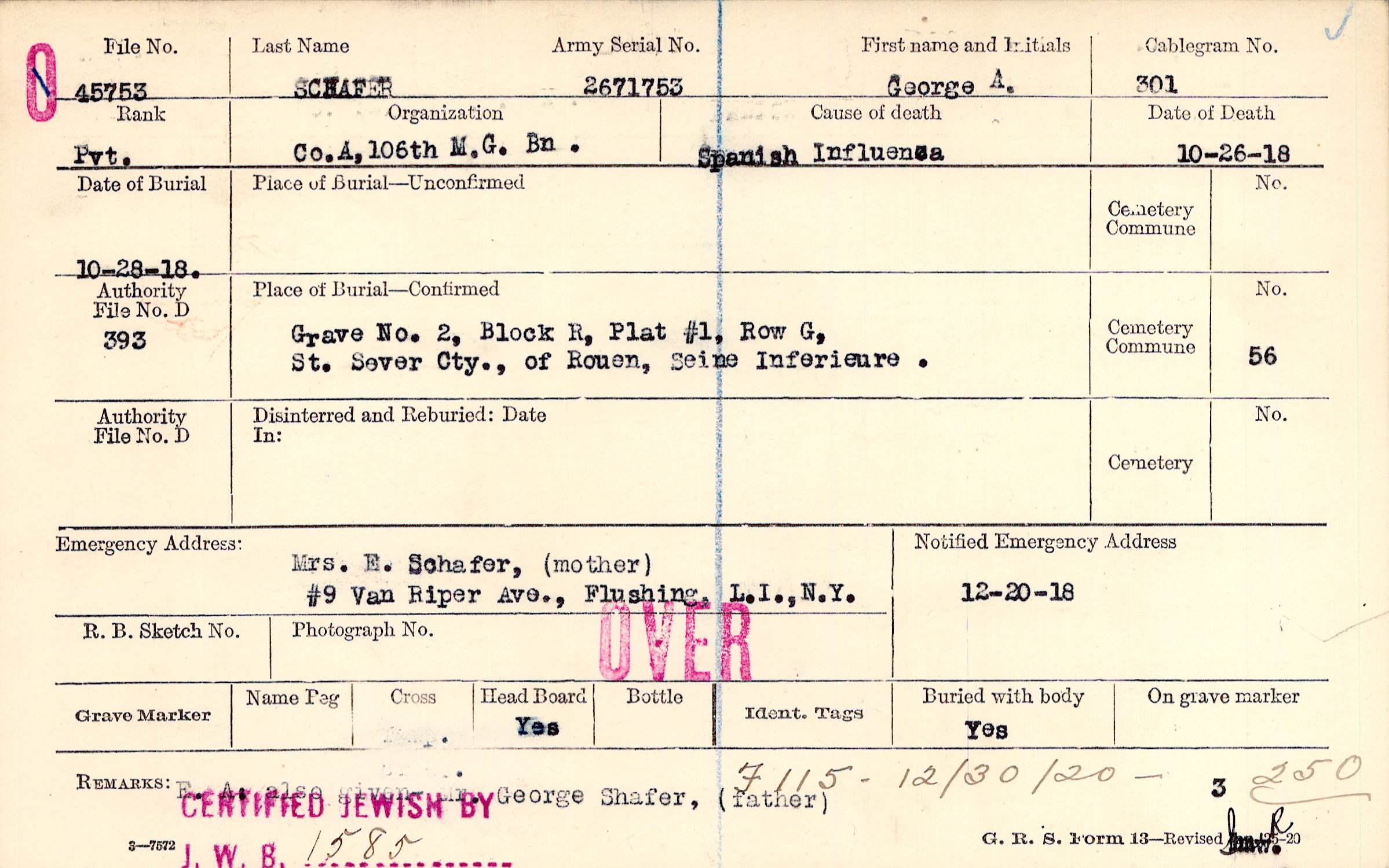 Grave 2, Block R, Plat #1, Row G, St. Sever Cty., of Rouen, Seine Inferieure.