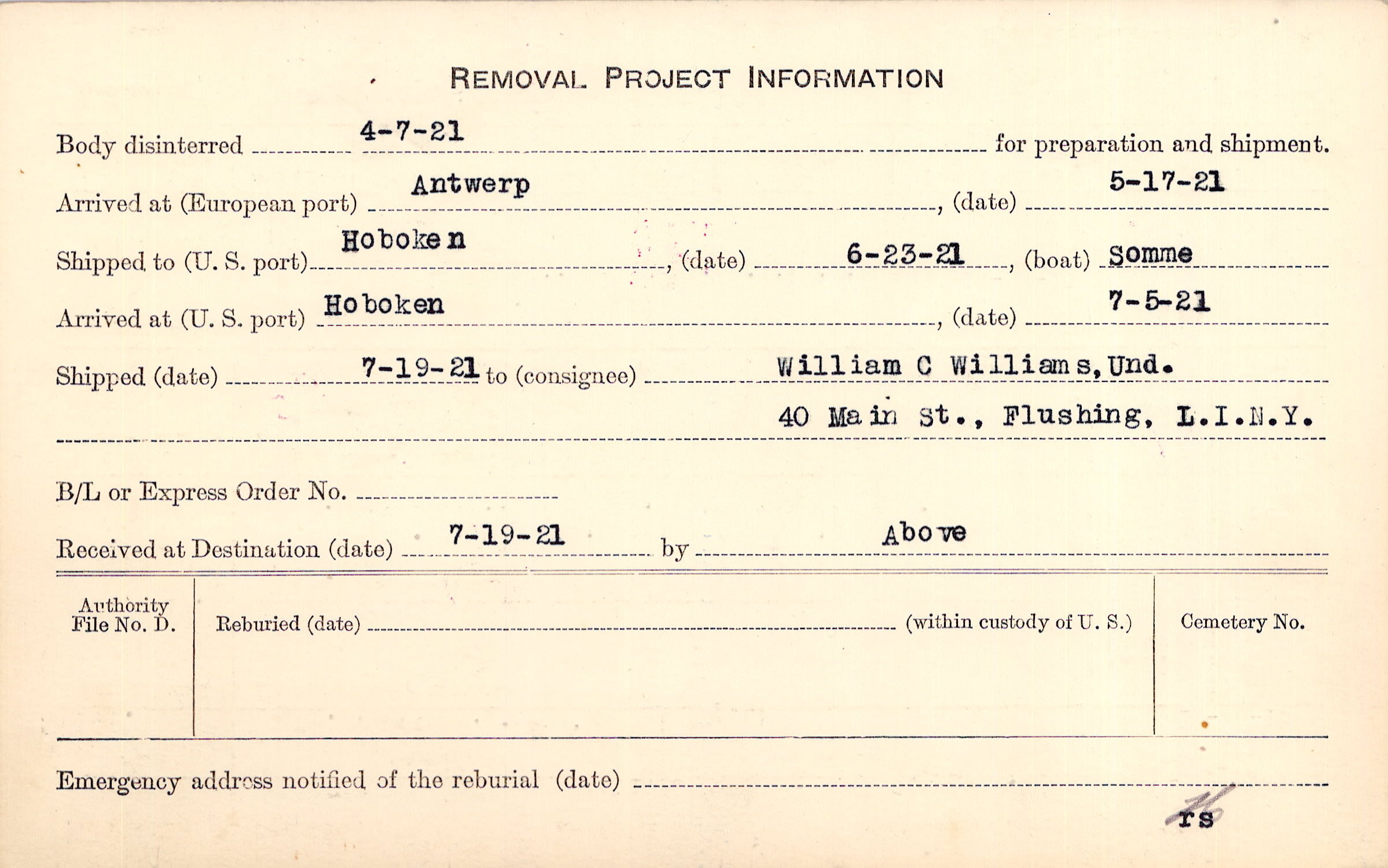 Body disinterred 4/7/1921 for preparation and shipment.