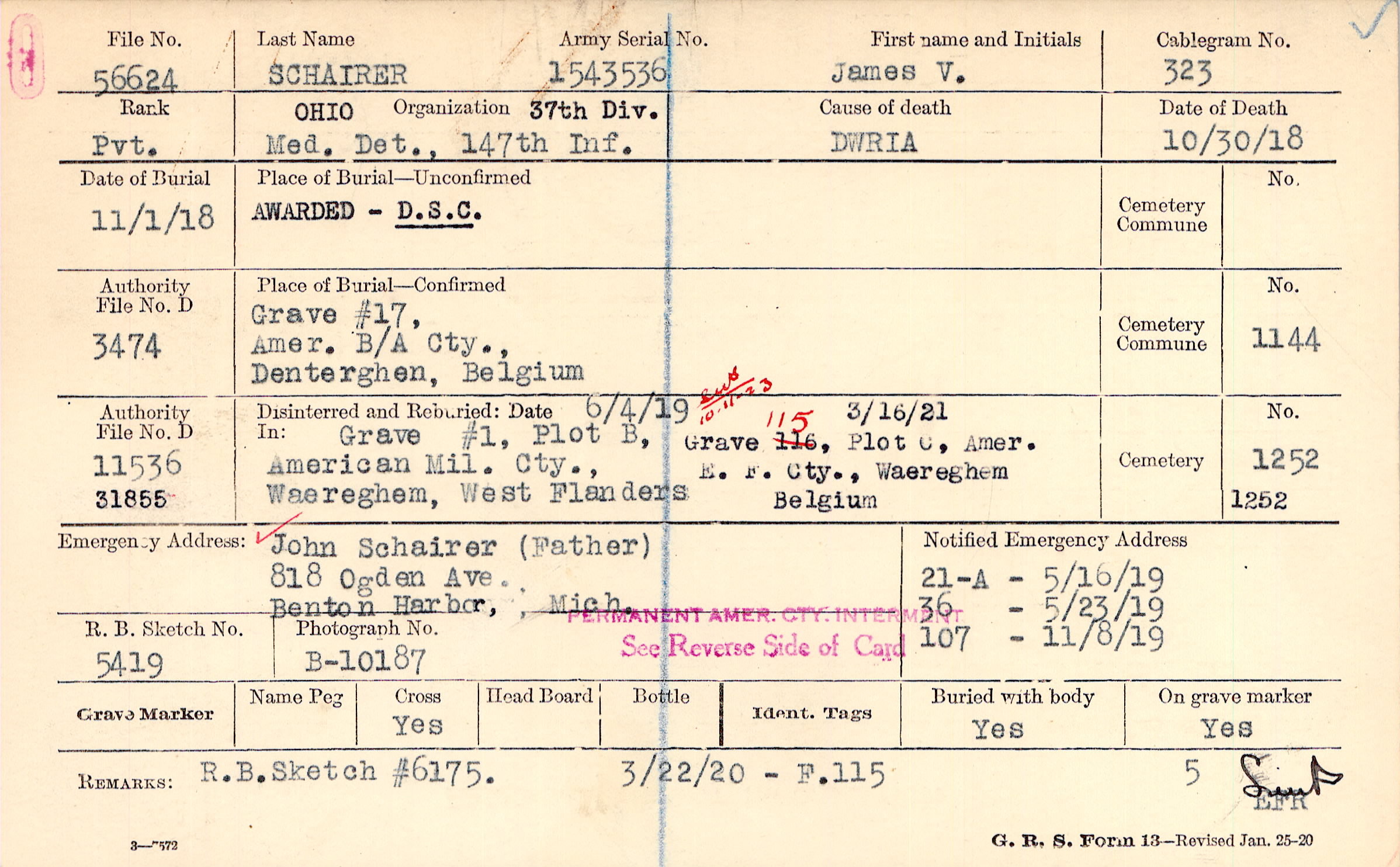 John Schairer (Father), 818 Ogden Ave., Benton Harbor, Mich.