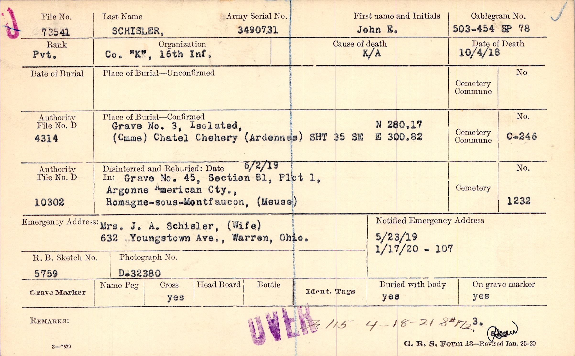 Mrs. J. A. Schisler, (Wife), 632 Youngstown Ave., Warren, Ohio.