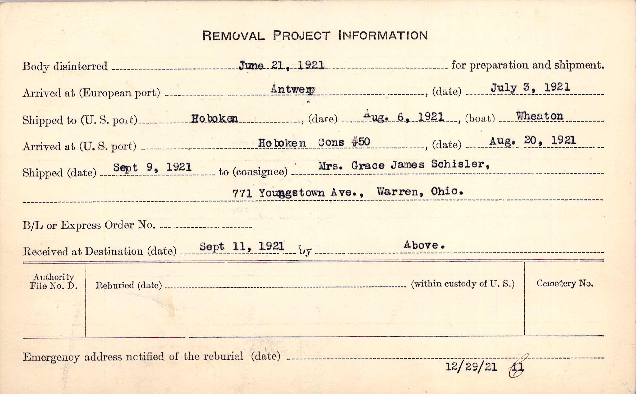 Body disinterred 6/21/1921 for preparation and shipment.
