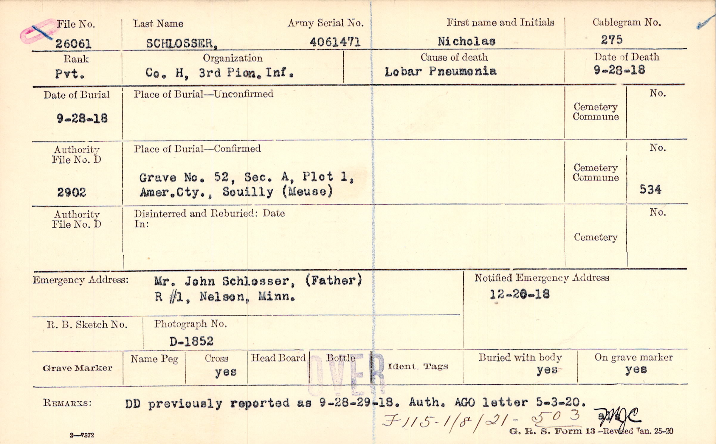 Grave 52, Sec. A, Plot 1, Amer. Cty., Souilly, Meuse