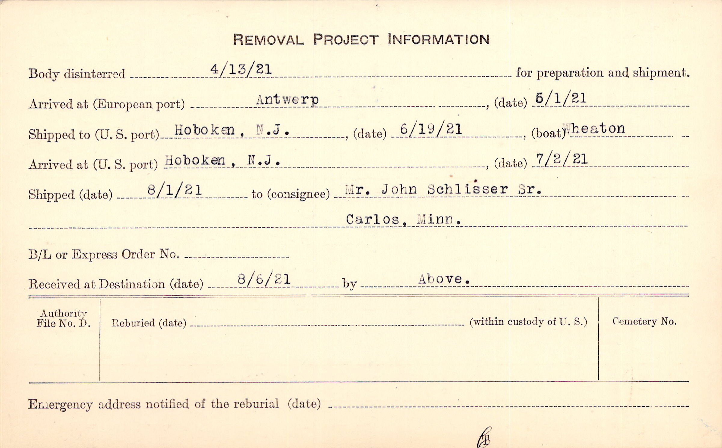 Body disinterred 4/13/1921 for preparation and shipment.