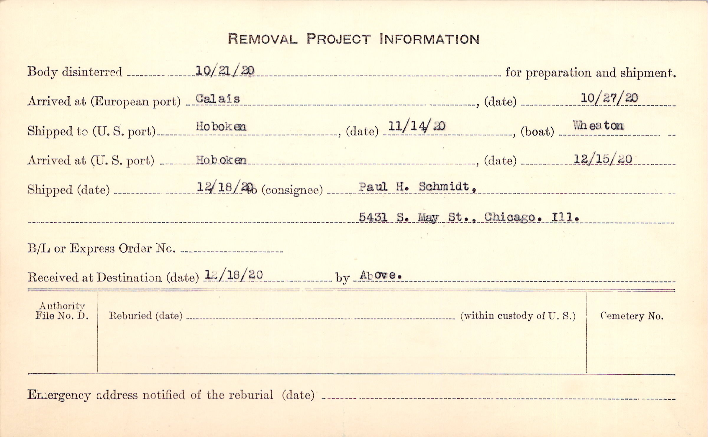 Body disinterred 10/21/1920 for preparation and shipment.