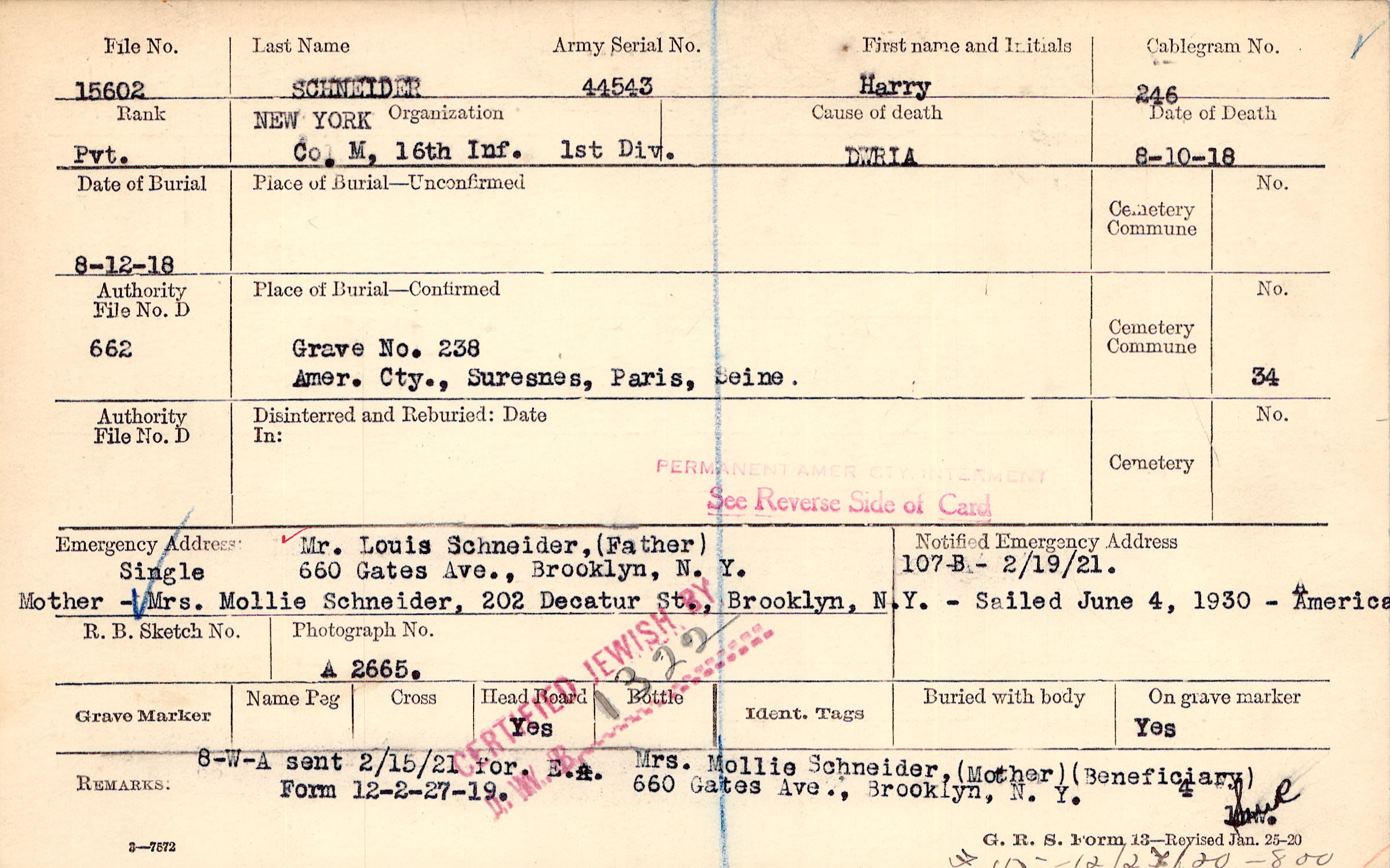 8-W-A sent 2/15/21 for E.A. Mrs. Mollie Schneider, (Mother) (Beneficiary) 660 Gates Ave., Brooklyn, N.Y., Form 12-2-27-19., F115 12/27/20 - 800