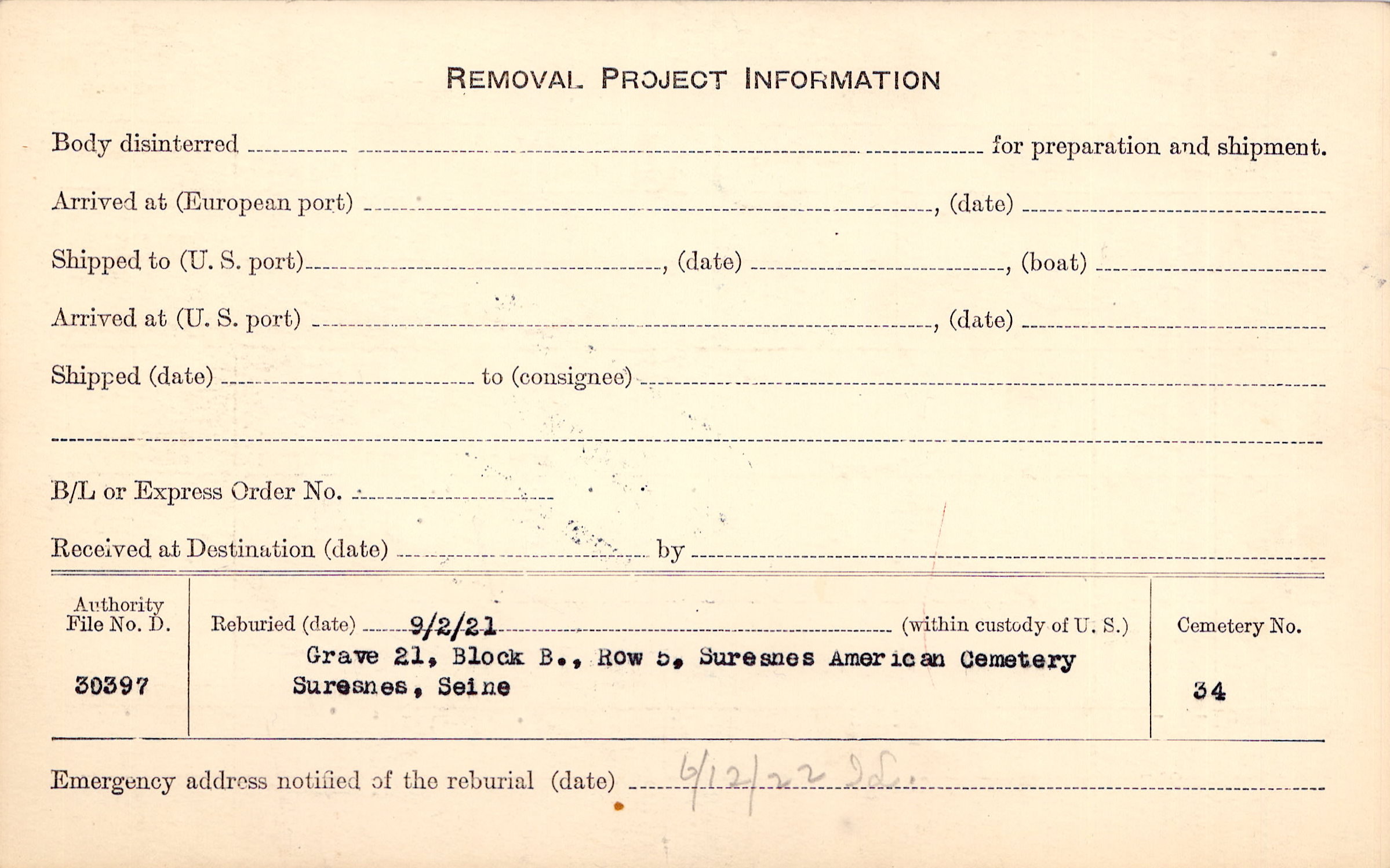 | Permanent Burial in Foreign Cemetery |