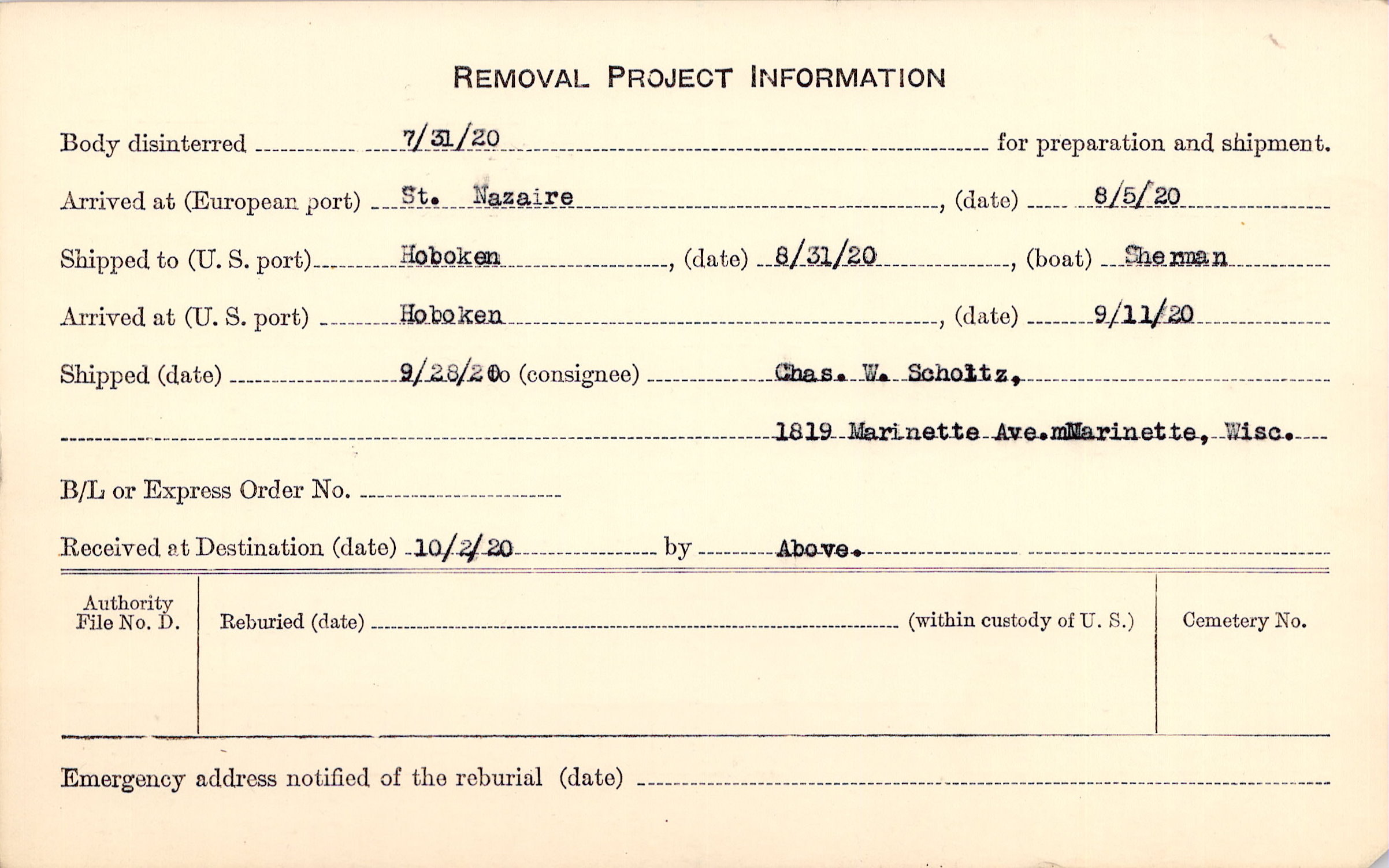 Body disinterred 7/31/1920 for preparation and shipment.