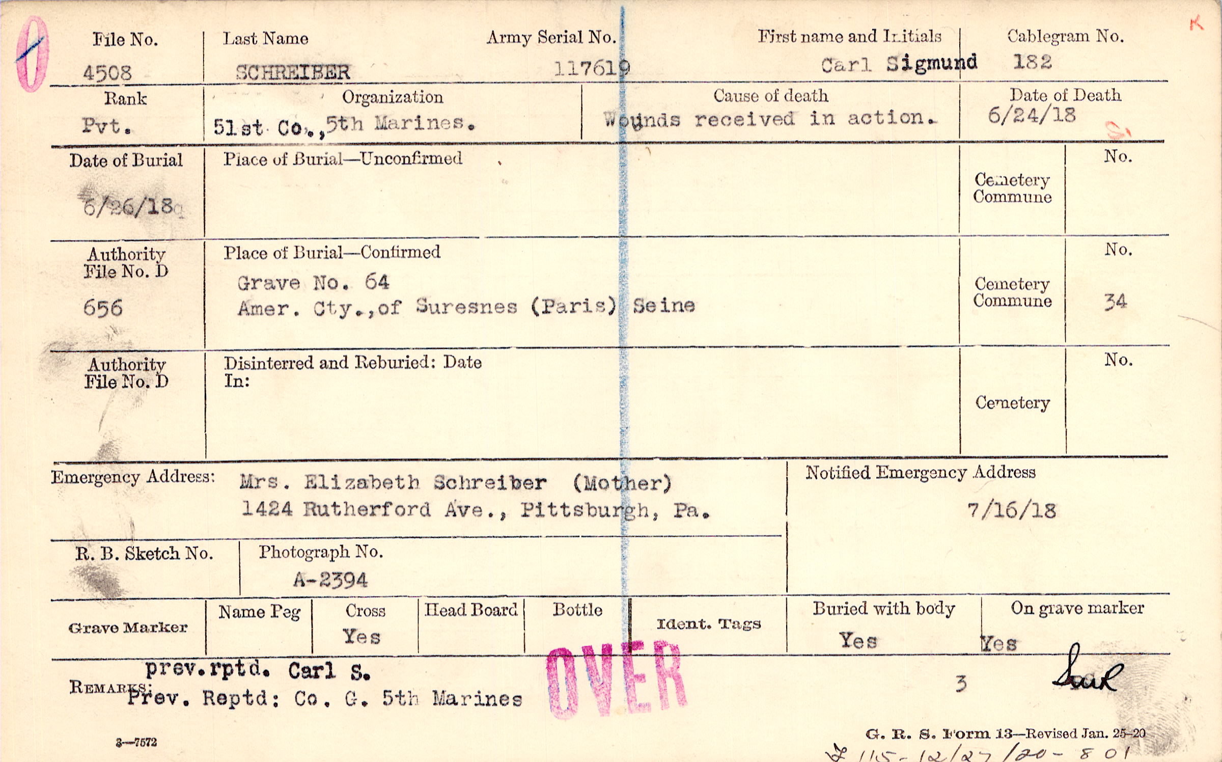 prev. rptd. Carl S. Prev. Reptd: Co. G. 5th Marines, F115-12/27/20-801