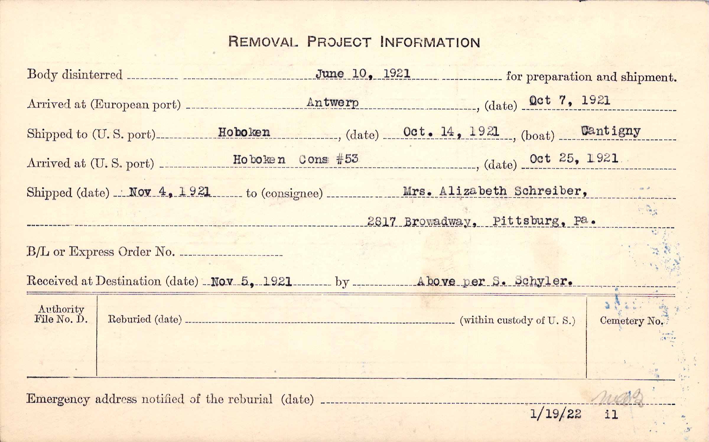 Body disinterred 6/10/1921 for preparation and shipment.
