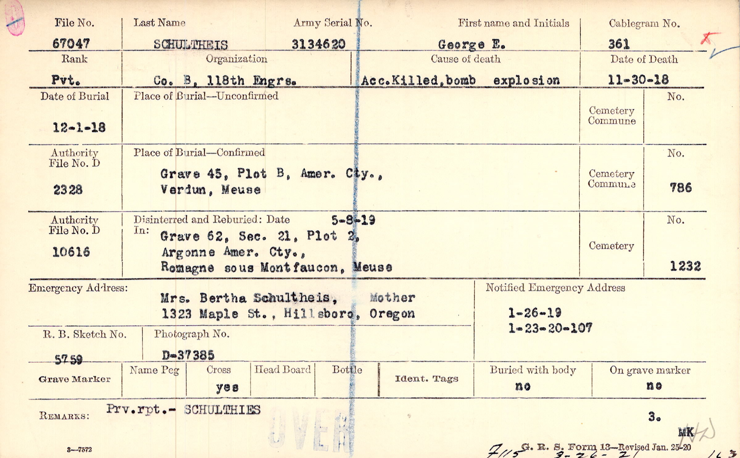 Mrs. Bertha Schultheis, Mother, 1323 Maple St. , Hillsboro, Oregon