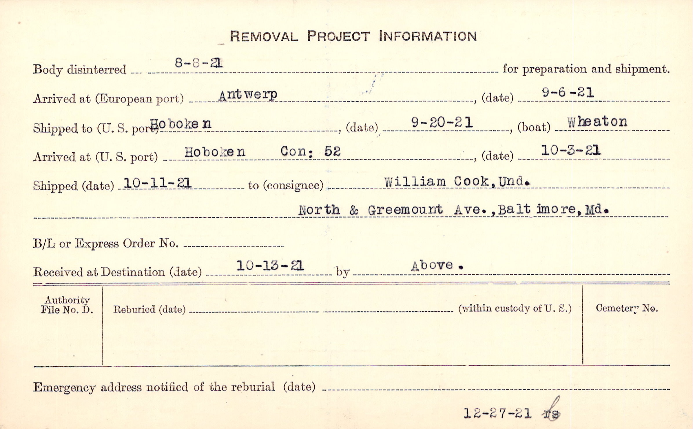 Body disinterred 8/8/1921 for preparation and shipment.