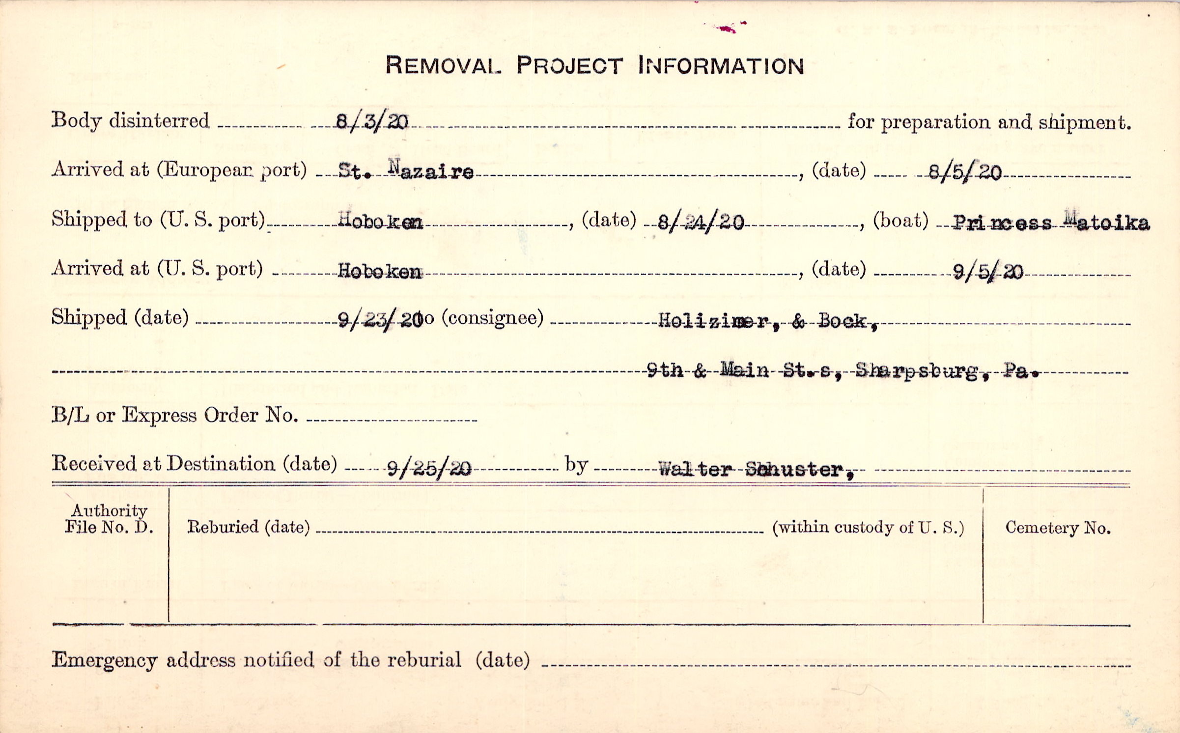 Body disinterred 8/3/1920 for preparation and shipment.