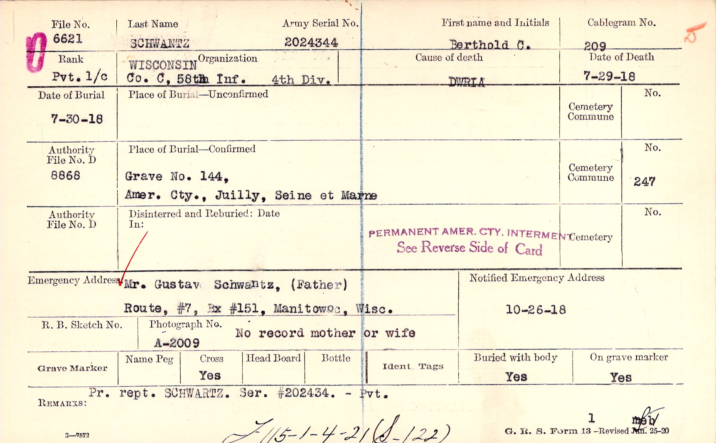 Mr. Gustav Schwantz, (Father), Route, #7, Bx #151, Manitowoc, Wisc., No record mother or wife