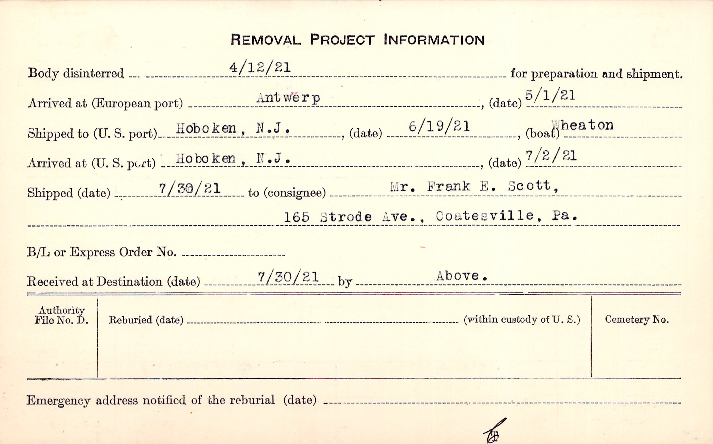 Body disinterred 4/12/1921 for preparation and shipment.
