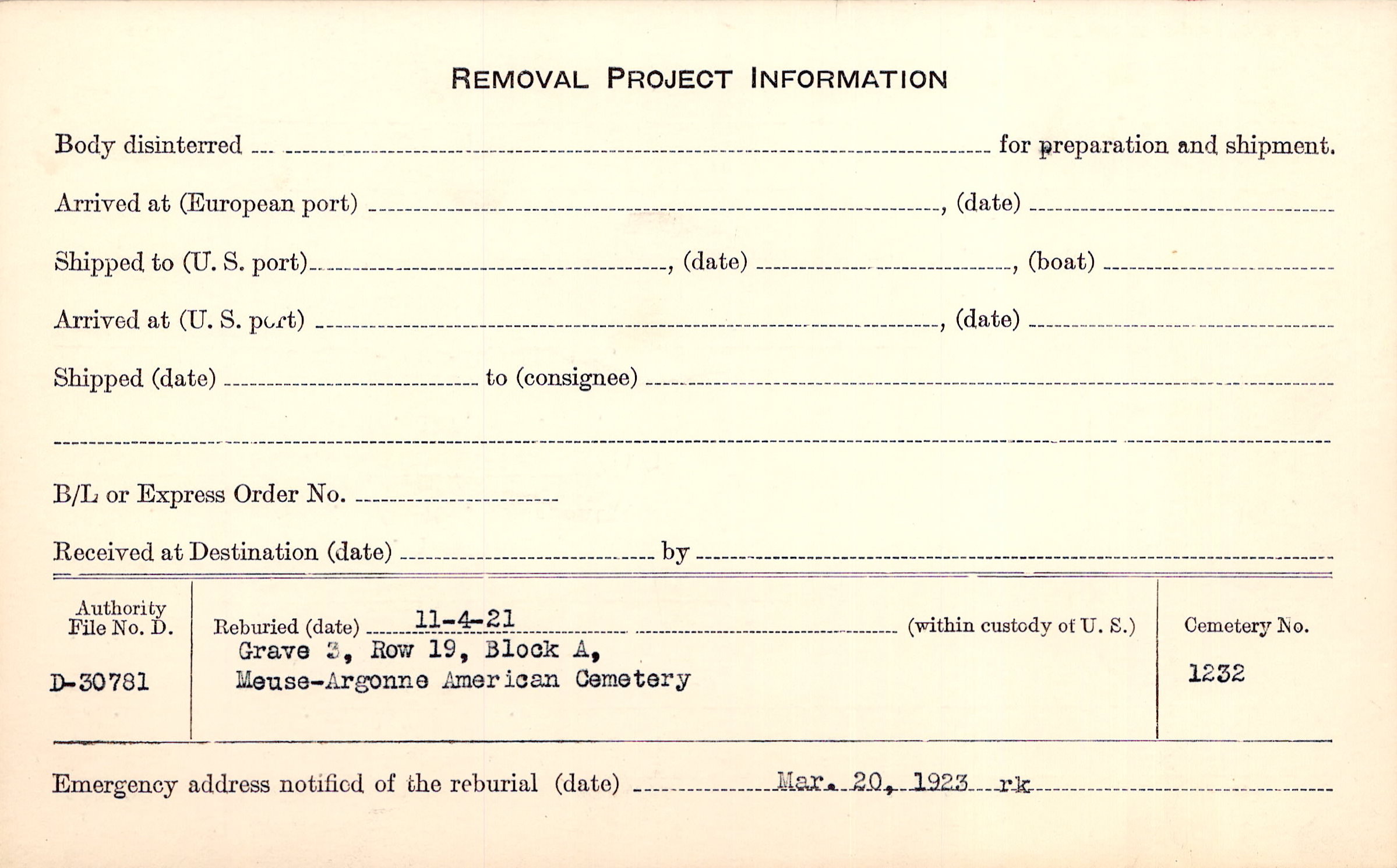 | Permanent Burial in Foreign Cemetery |