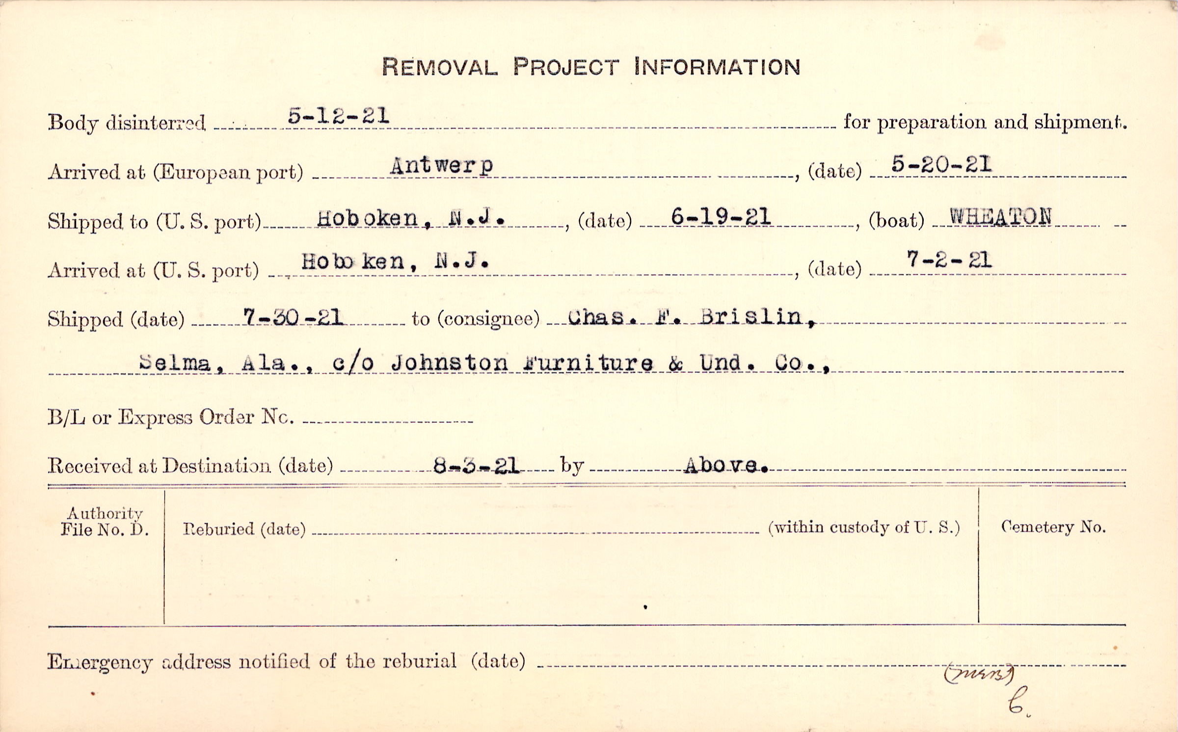Body disinterred 5/12/1921 for preparation and shipment.