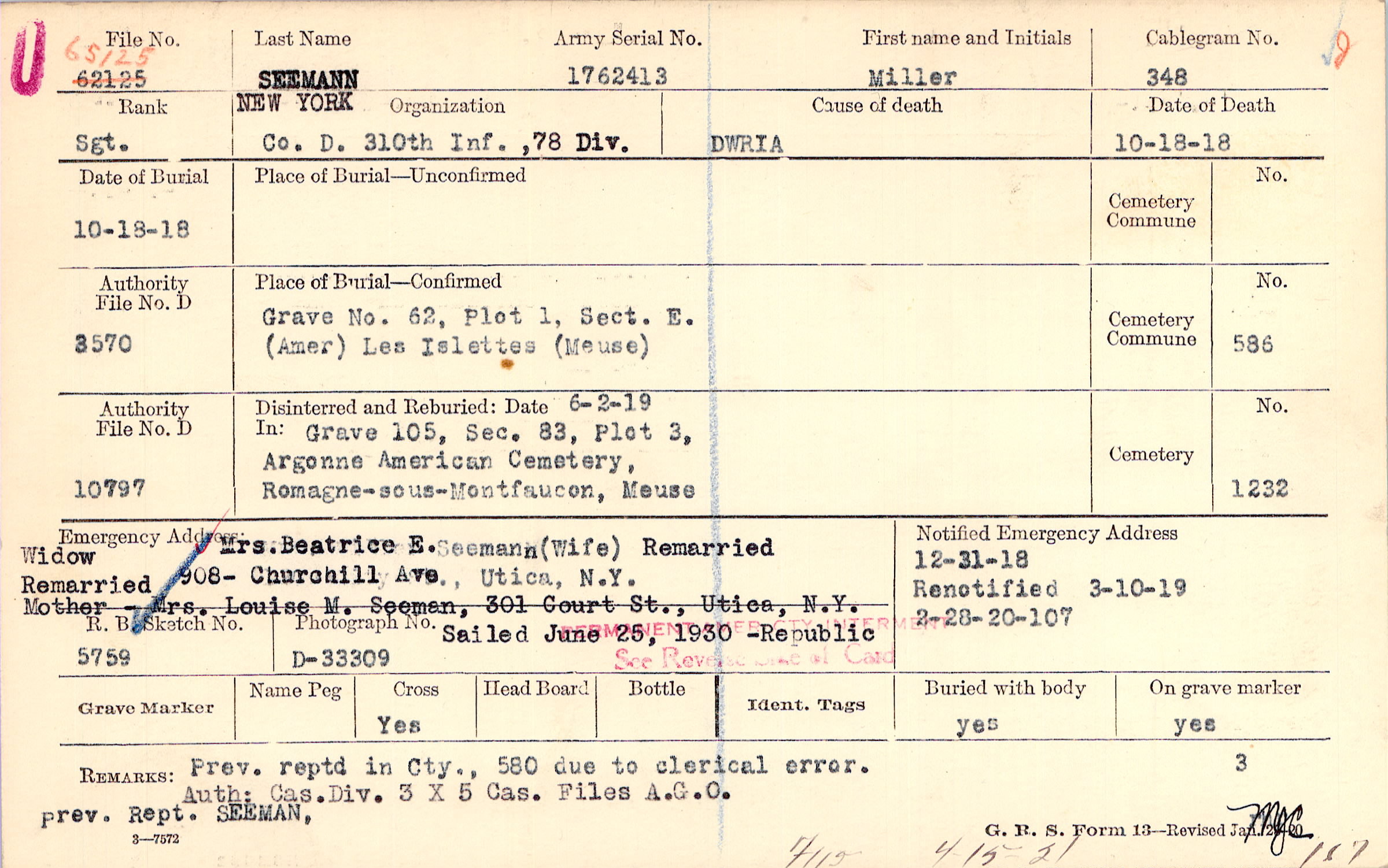 Mrs. Beatrice E. Seemann (Wife), 908- Churchill Ave., Utica, N.Y., Widow Remarried Mother - Mrs. Louise M. Seeman, 301 Court St., Utica, N.Y. Sailed June 25, 1930 - Republic